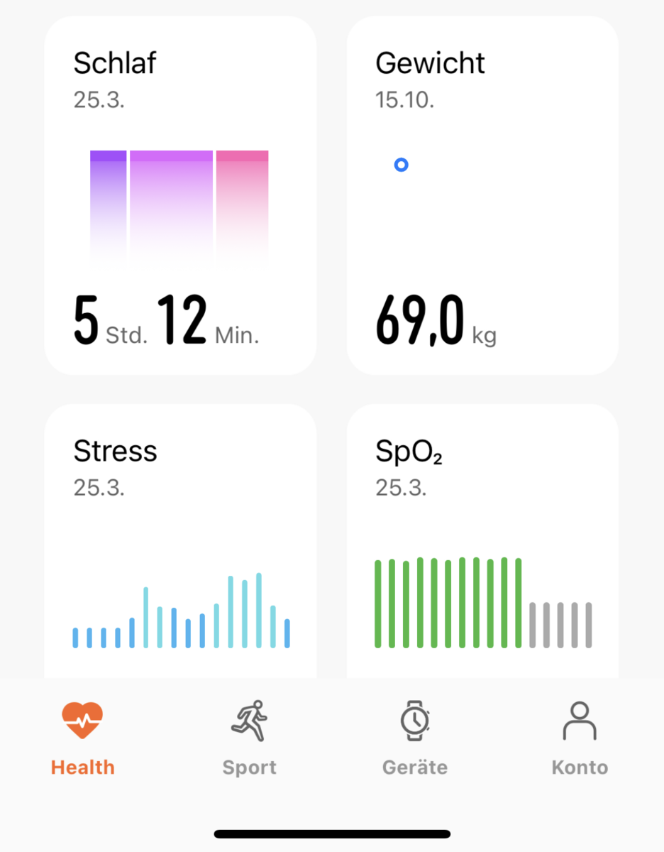 Mit der neuen ganztägigen SpO2-Messung und -Warnung kommt die Watch Fit im aktuellen Test noch auf 4 Tage. Ein Opfer, das man bei Interesse an der Gesundheitsfunktion vermutlich zu bringen bereit ist.
