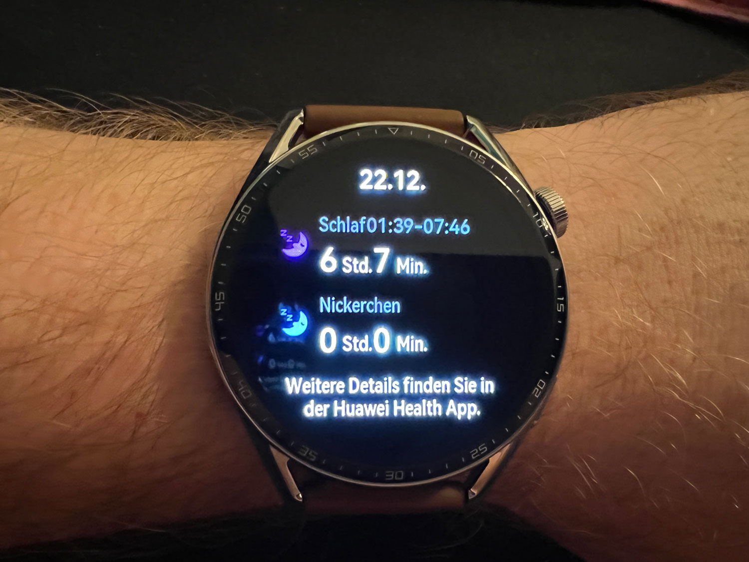 Am Morgen wird die Länge des Schlafes angezeigt. Eine ausführliche, aber leider nicht sehr übersichtliche Auswertung über Schlafphasen und -qualität gibt es leider nur in der Huawei Health App auf dem Smartphone. Ein paar mehr Details direkt auf dem Wearable wären schön und würden den Umweg über die Smartphone-App ersparen.