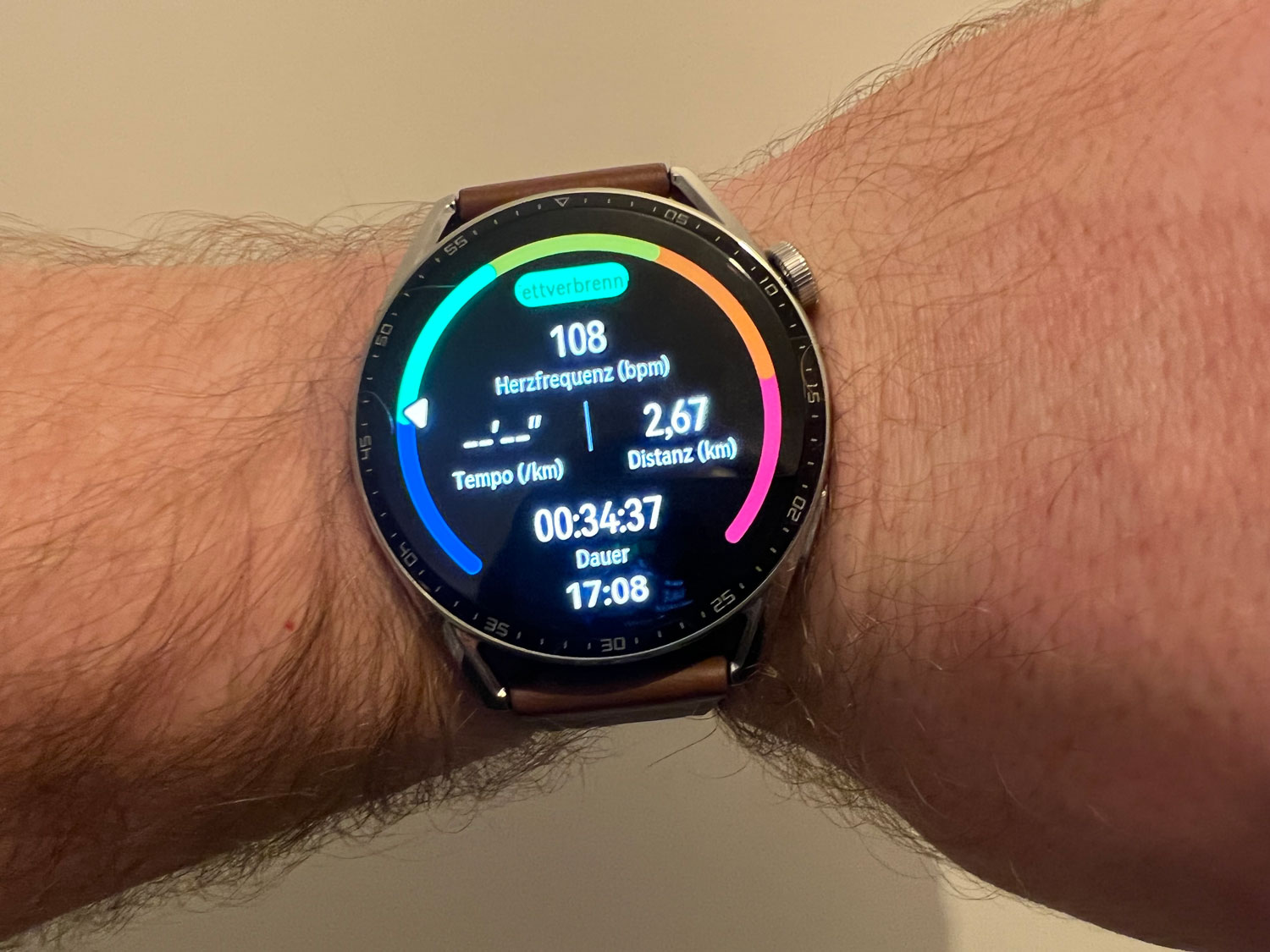 Die Uhr trackt je nach Sportart unterschiedliche Messwerte. Beim Joggen und Gehen sind dies z. B. die zurückgelegte Distanz sowie der Streckenverlauf (lässt sich über Huawei Health einsehen), die Geschwindigkeit, die Dauer und natürlich die Herzfrequenz. Ein farbiger Balken samt Markierungspfeil lässt zudem auf einen Blick erkennen, in welchem Bereich man gerade trainiert. Das ist praktisch. Eine ausführliche Auswertung erfolgt auch hier nur auf dem Smartphone. Zudem kann über die Smartwatch der unter anderem für Läufer interessante VO2max-Wert bestimmt werden.