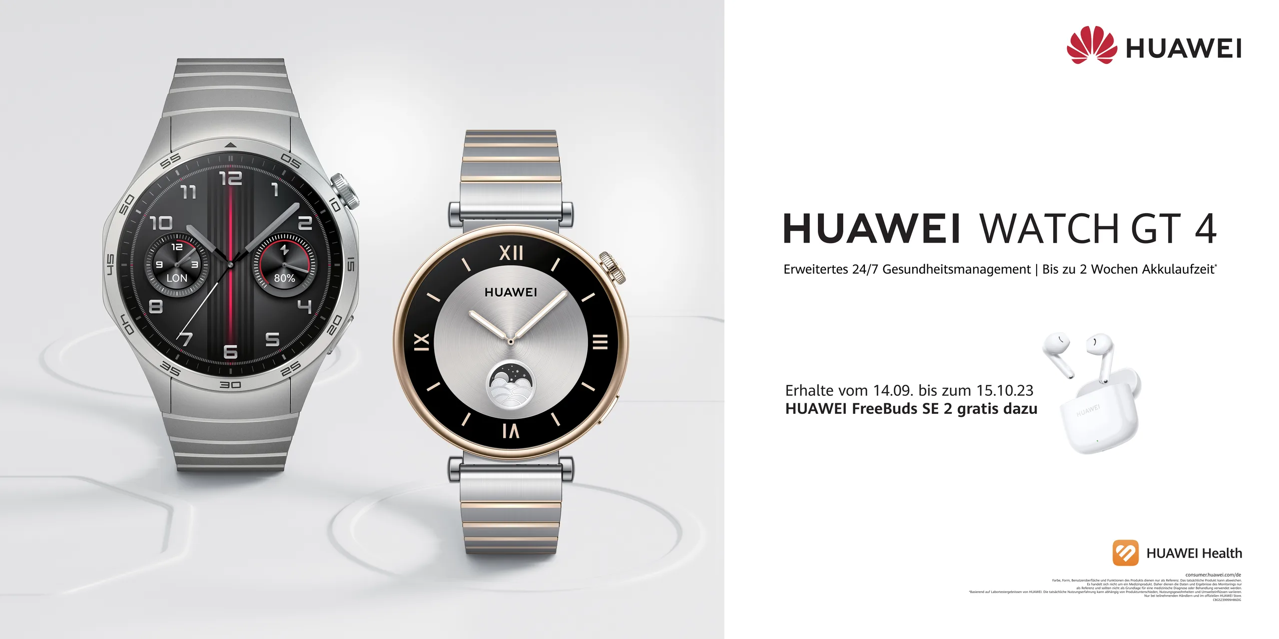 Egal für welche Variante der Huawei Watch GT 4 das Herz schlägt, früh zuschlagen lohnt sich. Zum Verkaufsstart der neuen Smartwatch, die ab 249 Euro beim Hersteller erhältlich ist, legt Huawei bis zum 15. Oktober 2023 die Huawei FreeBuds SE 2 in Weiß im Wert von 49 Euro laut UVP sowie eine Garantieverlängerung auf drei Jahre gratis bei. Und wer den Gutscheincode ANBCGT4AB im Bestellvorgang einlöst, bekommt auch noch ein Armband geschenkt.