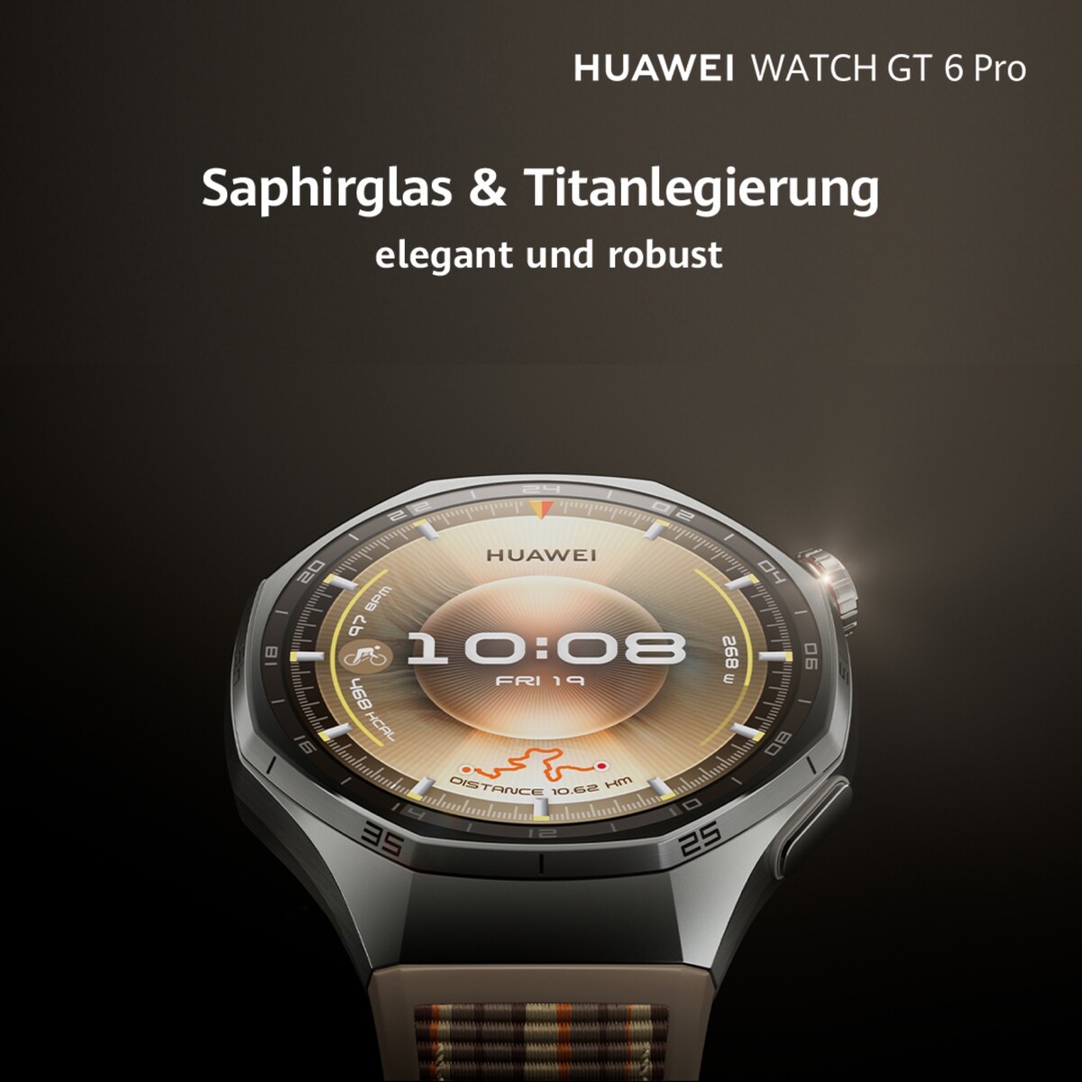 Die Huawei Watch GT 6 ist ab sofort für eine unverbindliche Preisempfehlung von 249 Euro erhältlich, wahlweise mit einem Gehäuse-Durchmesser von 41 mm oder 46 mm. Die Huawei Watch GT 6 Pro wird mit Sportarmband für 379 Euro, oder aber mit Titan-Armband für 499 Euro angeboten.
