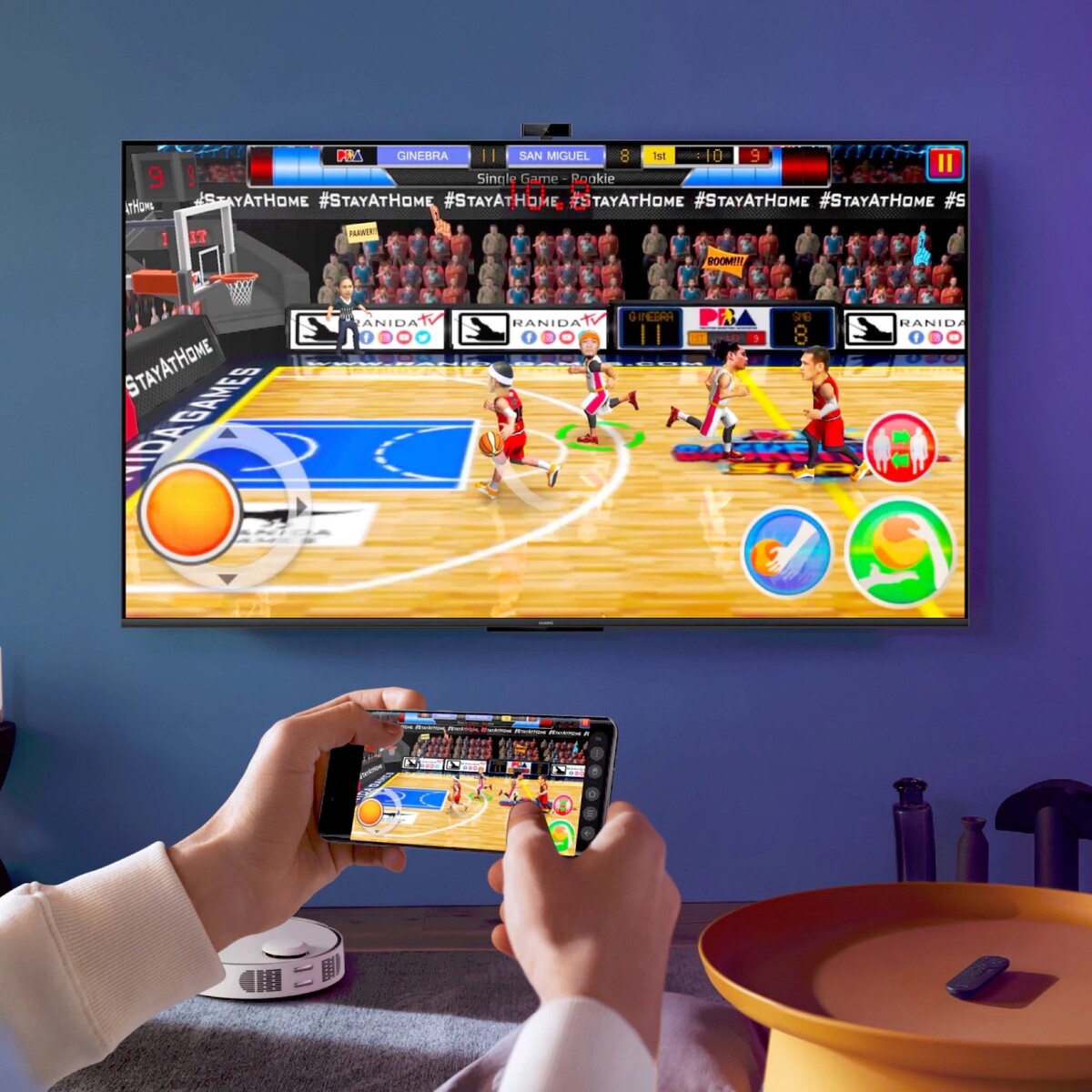 Da der Fernseher mit HarmonyOS 2.0 betrieben wird, sind in Kombination mit einem HarmonyOS-Smartphone einige spannende Features möglich. So lässt sich der Bildschirminhalt des Smartphones auf den Fernseher übertragen, indem man einfach die Fernbedienung mit diesem antippt, alternativ lässt sich das Smartphone auch als Fernsteuerung oder Gaming-Controller für den TV verwenden.
