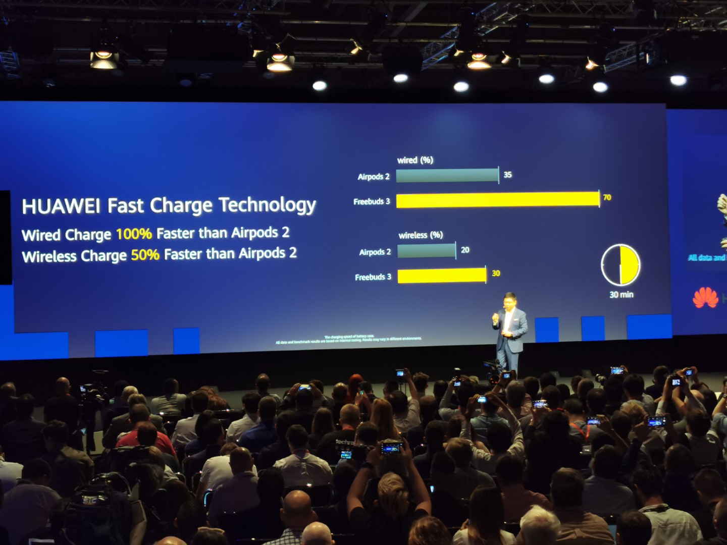 Huawei vergleicht sich gern mit den anderen großen der Branche, insbesondere Apple und Samsung und das taten sie auch bei der Präsentation der FreeBuds 3 im Rahmen der IFA-Keynote von Huawei-Boss Richard Yu. Die dritte Generation der True Wireless-Ohrhörer von Huawei sehen zwar so aus wie die AirPods von Apple, sollen aber viel besser sein, vor allem dank des neuen Kirin A1-Chips, der sich als Alternative zu Apples W1-Prozessor in den kleinen In-Ears befindet.