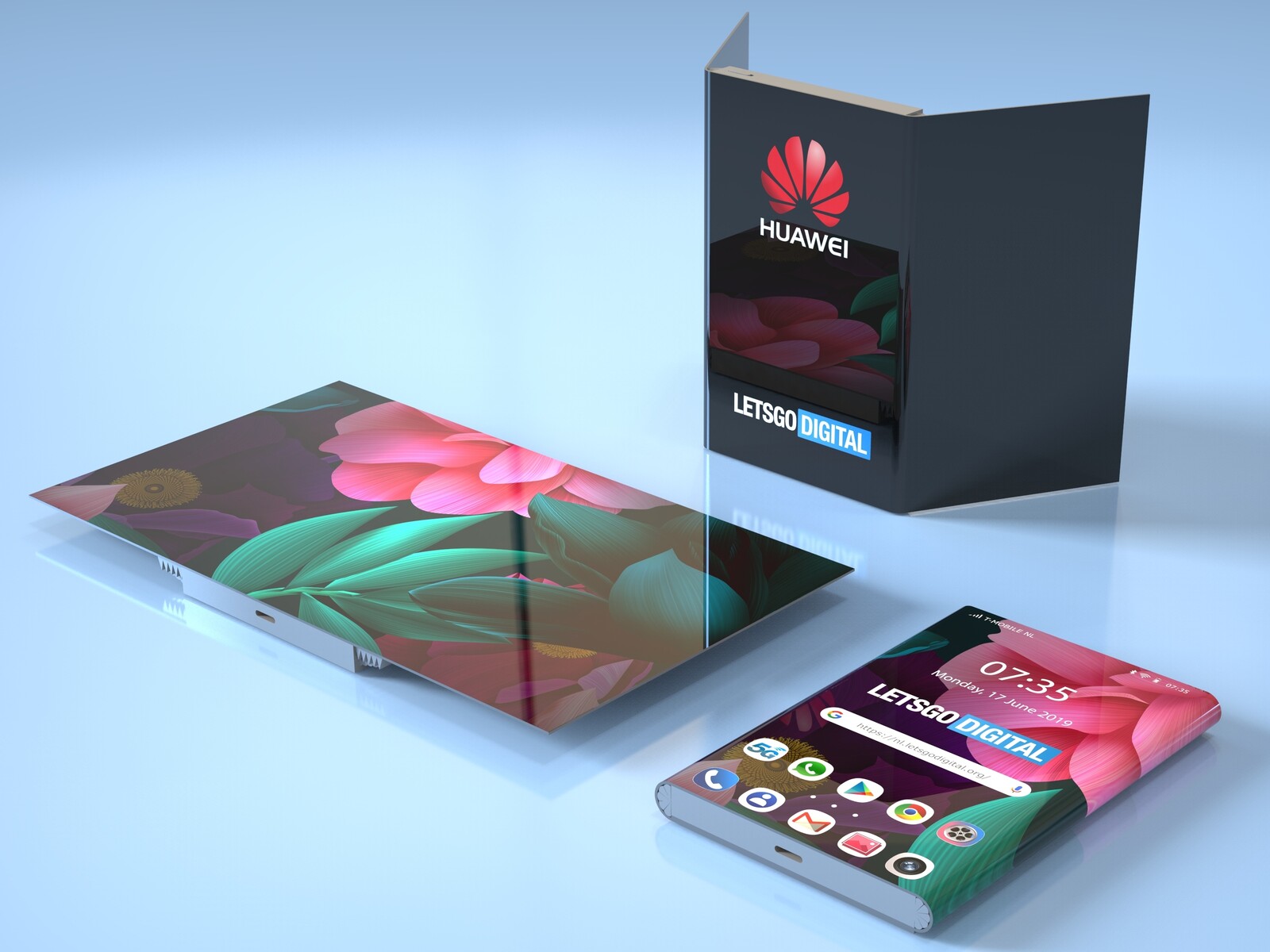 Das von den Niederländern jetzt beschriebene Falthandy-Design wurde von Huawei bereits im Sommer 2018 beim Europäischen Patentamt (EPA) bei der Dienstelle in Rijswijk angemeldet und am 31. Mai 2019 schließlich von der WIPO eingetragen. Für das neue faltbare Display-Design hat Huawei drei Modellentwürfe eingereicht, die alle ein rahmenloses und 2-mal umklappbares Display besitzen. Das Faltdisplay kann voll ausgeklappt als riesige Anzeige genutzt werden, im 2/3-Modus dient ein Displaysegment als Stand.