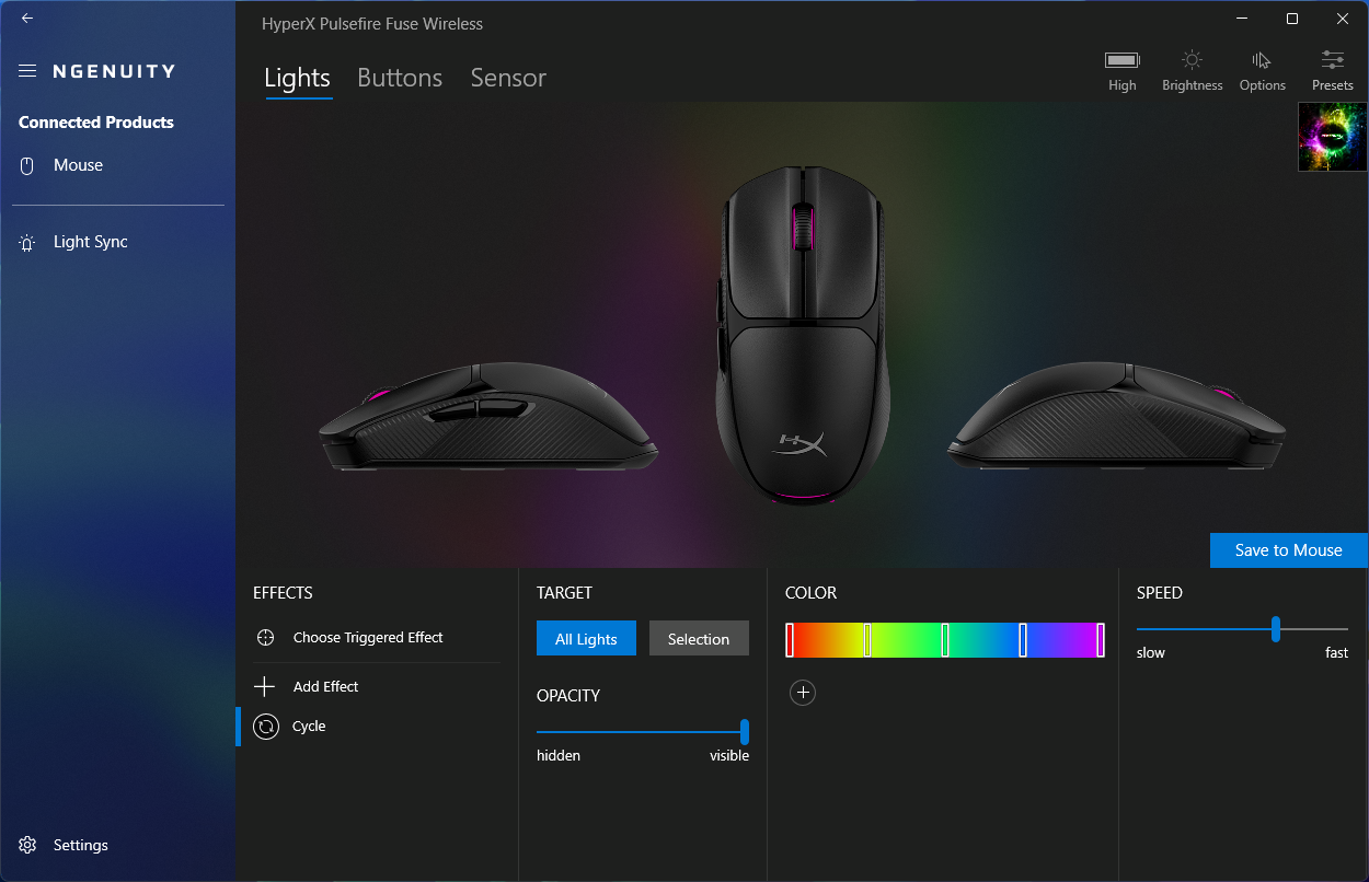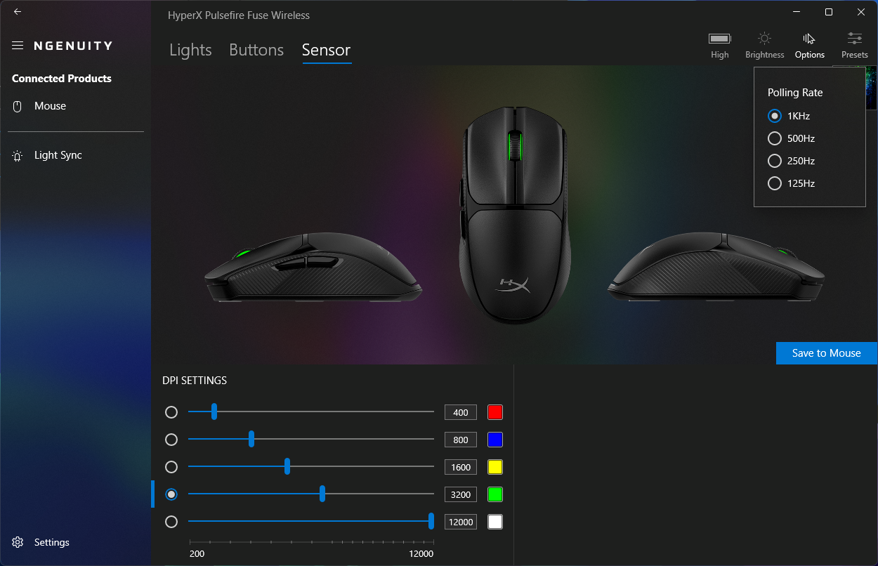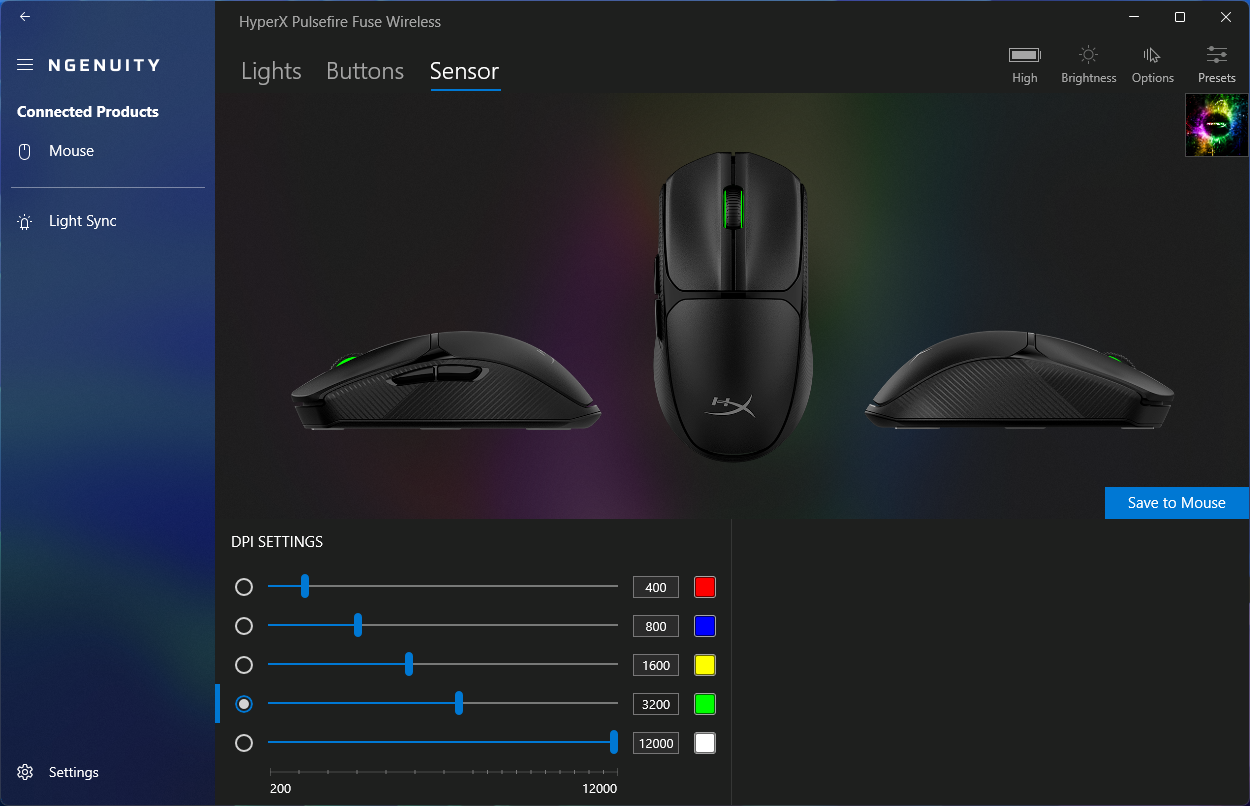 Die Pulsefire Fuse Wireless funktioniert ab Werk und benötigt keine zusätzliche Software. Für diejenigen, die mehr Kontrolle wünschen, bietet die HyperX Ngenuity app RGB-Anpassung und HyperX-Gerätesynchronisierung, Tastenzuordnung, Anpassung der Polling-Rate, bis zu fünf benutzerdefinierte DPI-Modi und einen Onboard-Speicher für Voreinstellungen.