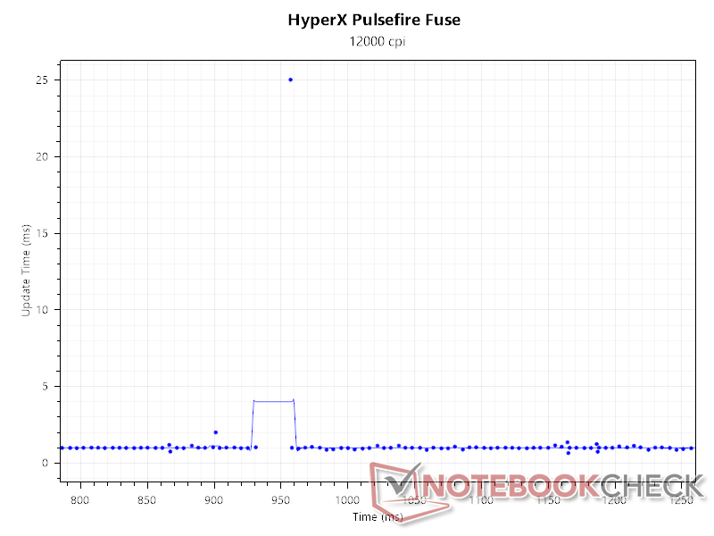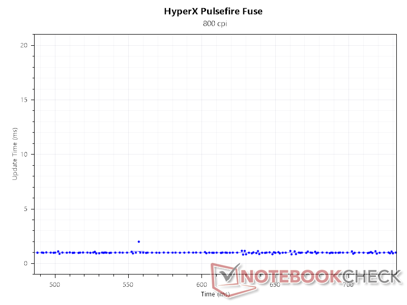 In Übereinstimmung mit den obigen Diagrammen zur Abfragerate stellen wir fest, dass das Aktualisierungsintervall bei 1.000 Hz und 800 DPI konstant 1 ms beträgt.