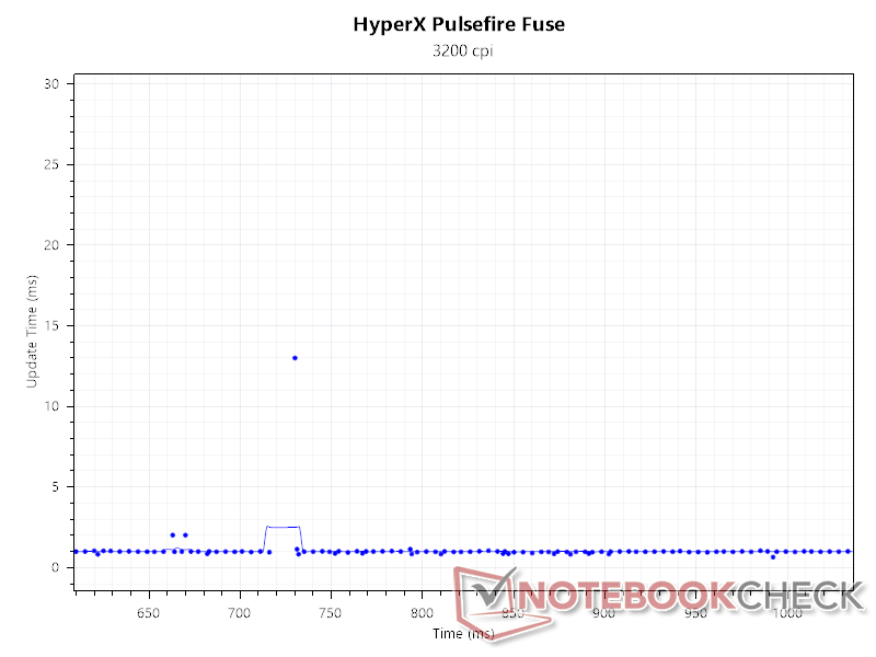 Es gibt zwar ein paar Frequenzeinbrüche, vor allem bei höheren DPI-Werten, aber diese beeinträchtigen das praktische Spielen nicht, da die Einbrüche in der Regel weniger als 40 ms dauern und die Mausbewegungen in der Realität eher zufällig und über kürzere Entfernungen erfolgen.