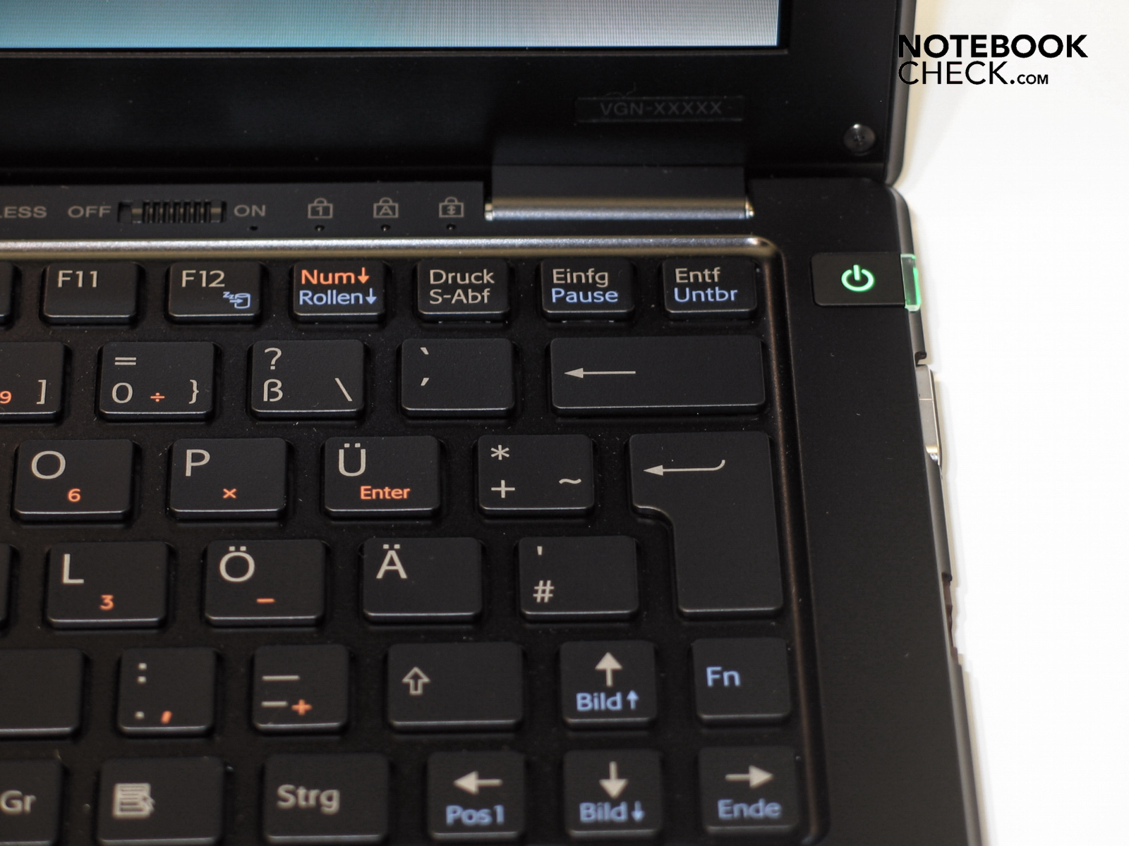 Als Eingabegerät kommt beim Sony Vaio X eine „Chiclet“-Tastatur (Einzeltasten) mit 84-Tasten zum Einsatz. Die Tasten haben einen angenehm geringen Hub und es lässt sich am Sony Vaio X überraschend kommod tippen. Das Touchpad ist für die Gerätegröße angemessen dimensioniert und arbeitet beim überprüften Pre-Sample auch präzise. Die beiden Touchpad-Tasten lassen sich ebenfalls mit recht kurzem Hub betätigen. Auffällig: Die Beschriftung der Tastatur-Zusatzfunktionen sind beim Sample in kräftigem Blau und Orange gehalten und lassen sich entsprechend einfach ablesen.
