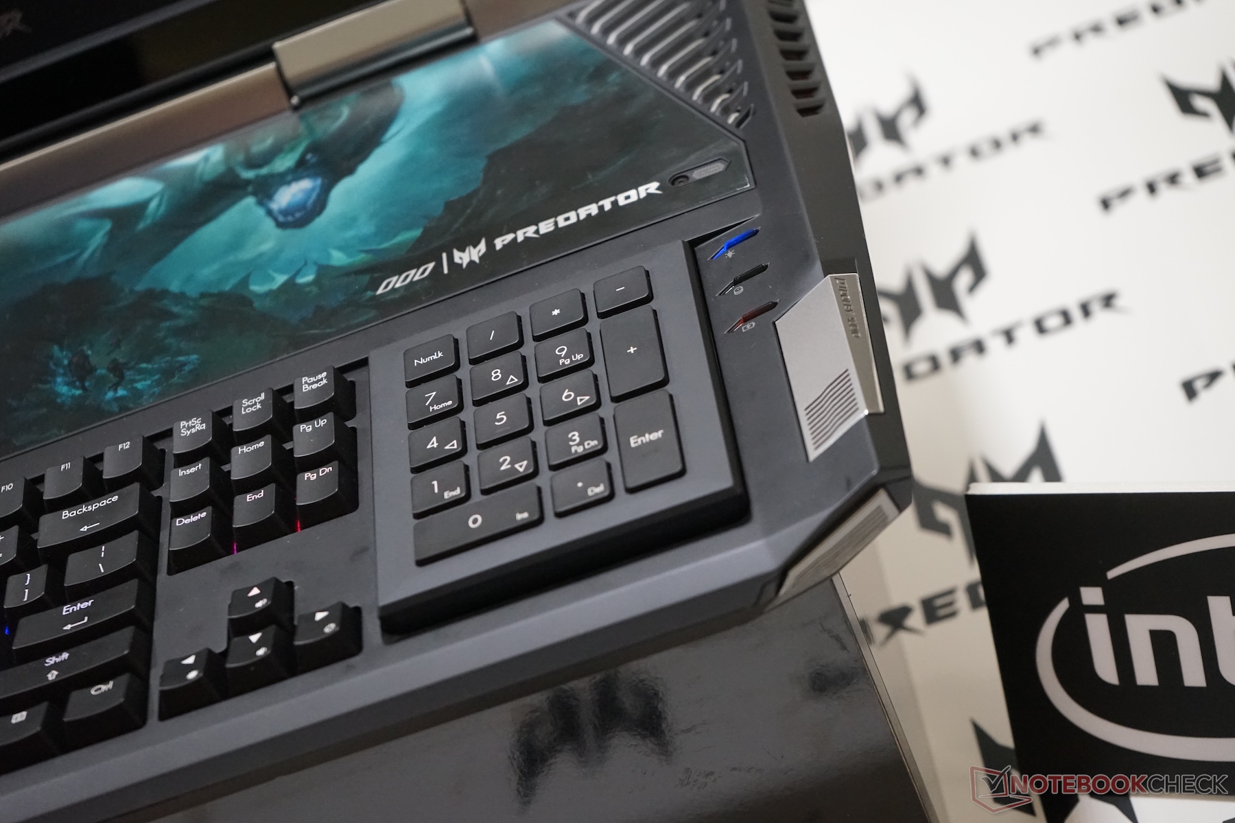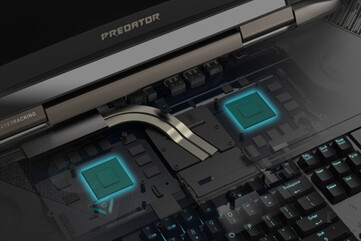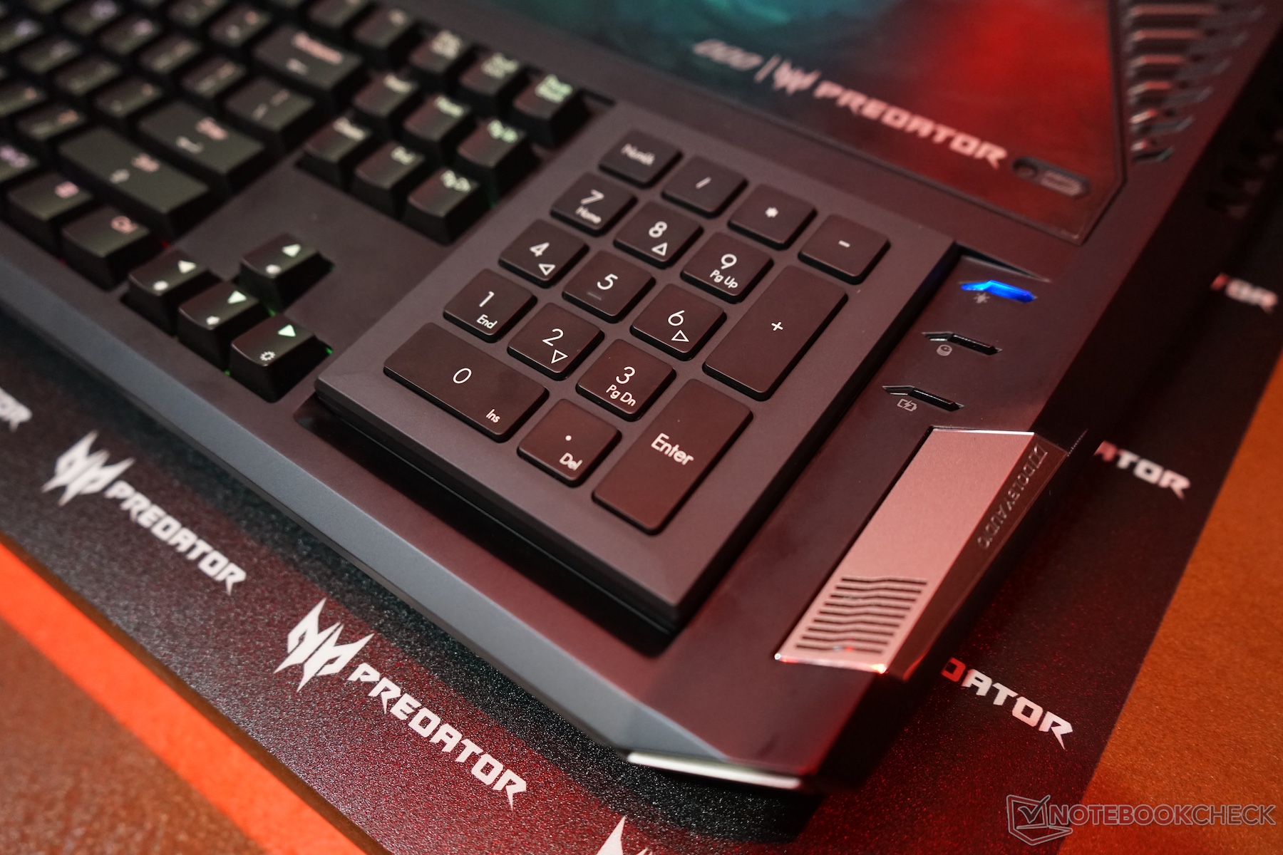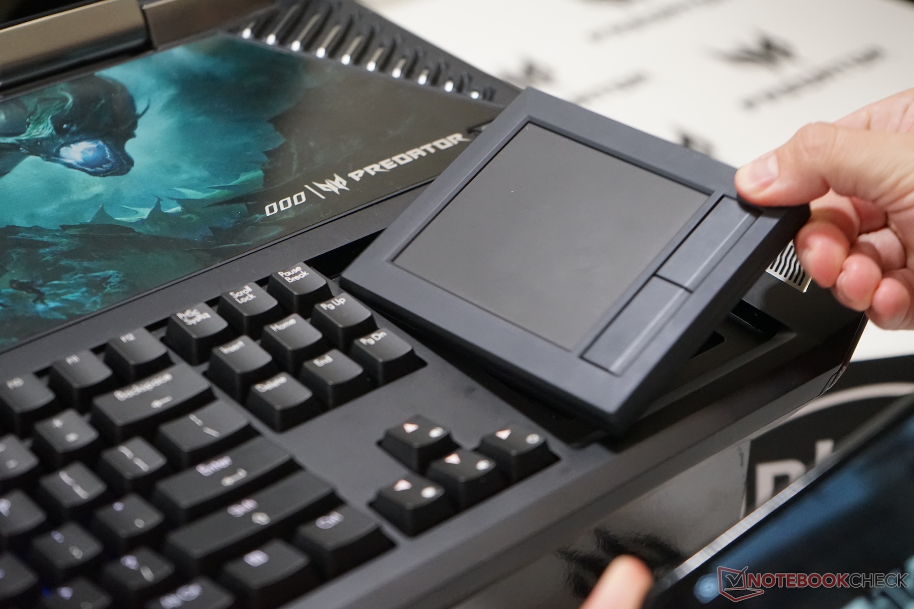 Das Acer Predator 21X bietet eine Tastatur mit mechanischen Cherry-MX-Switches. Jese Taste lässt sich individuell durch RGB-LEDs beleuchten. Weiteres Highlight ist der Tastenblock, der sich entnehmen und umdrehen lässt. Auf der Rückseite befindet sich ein Touchpad.