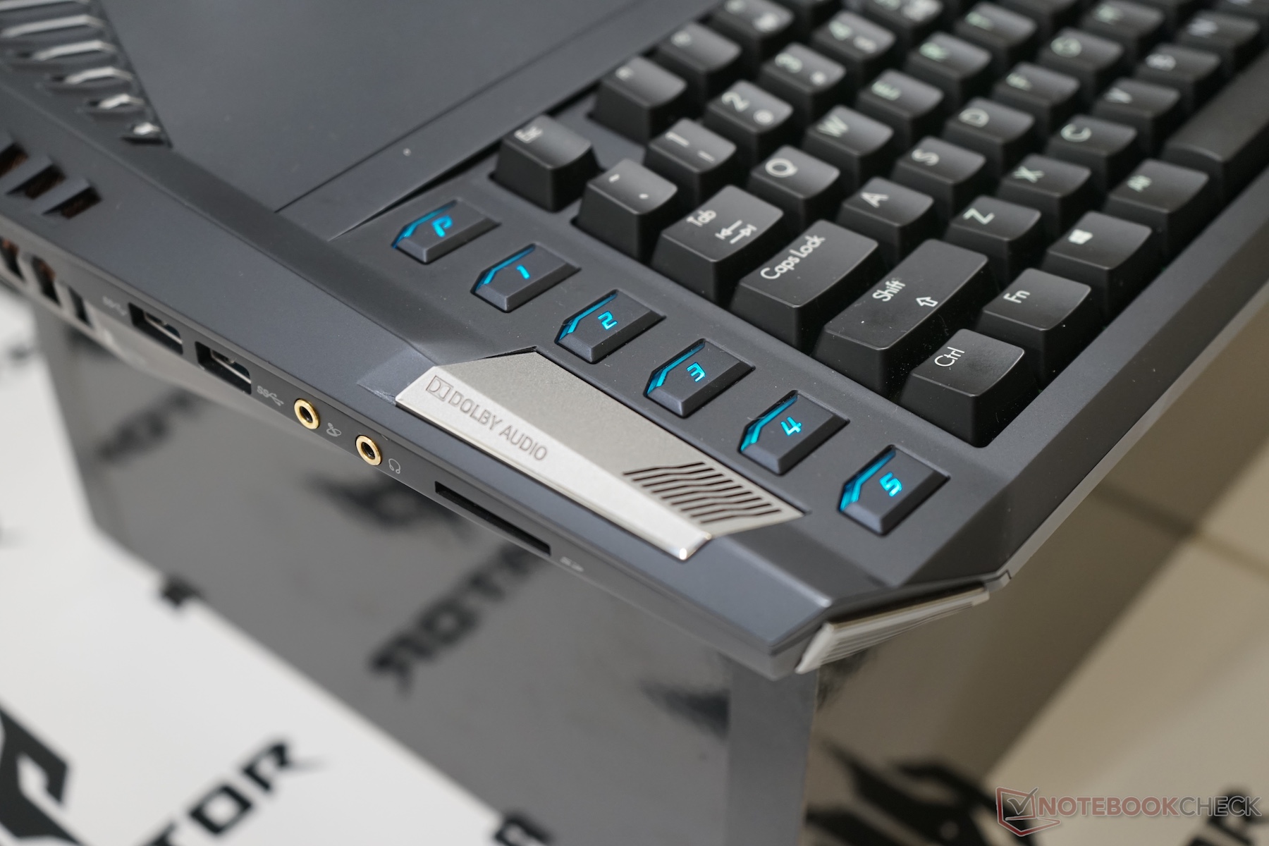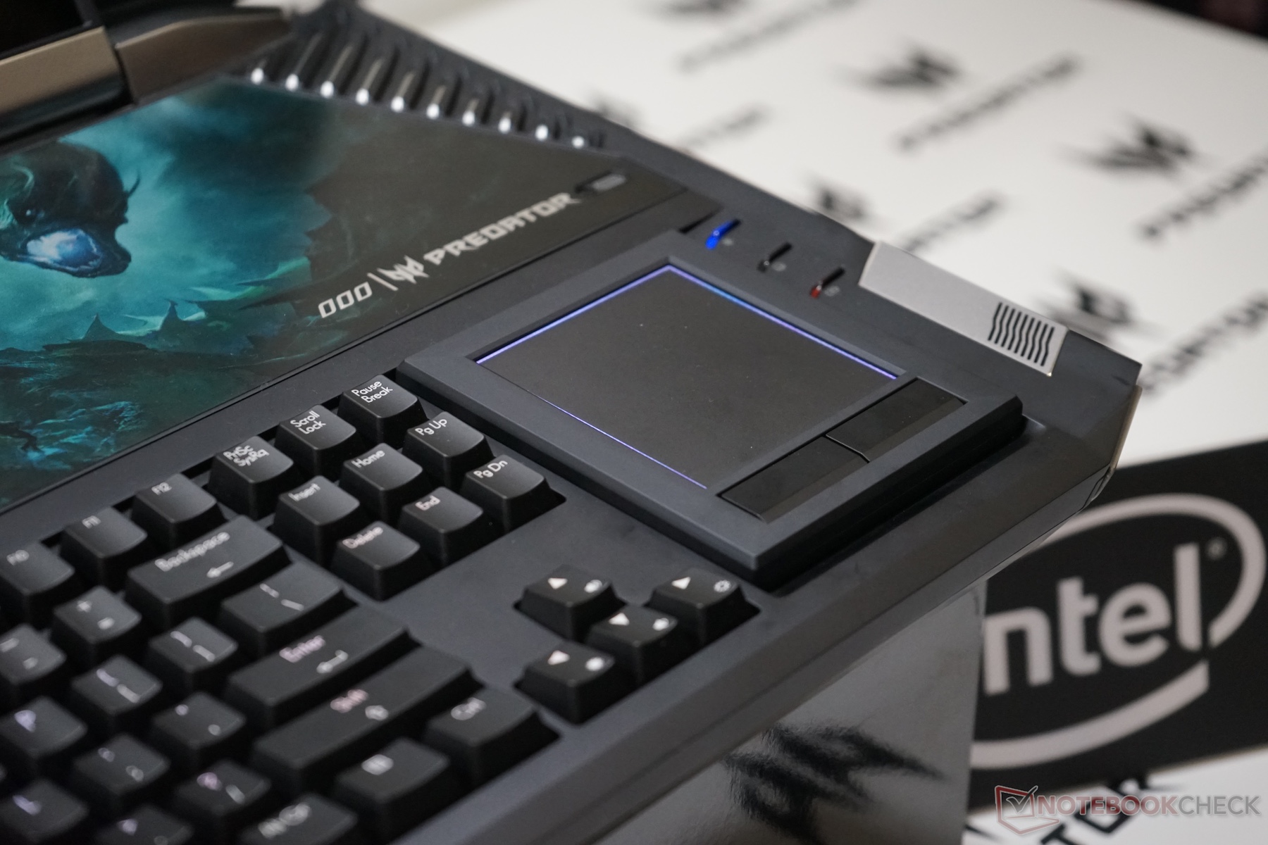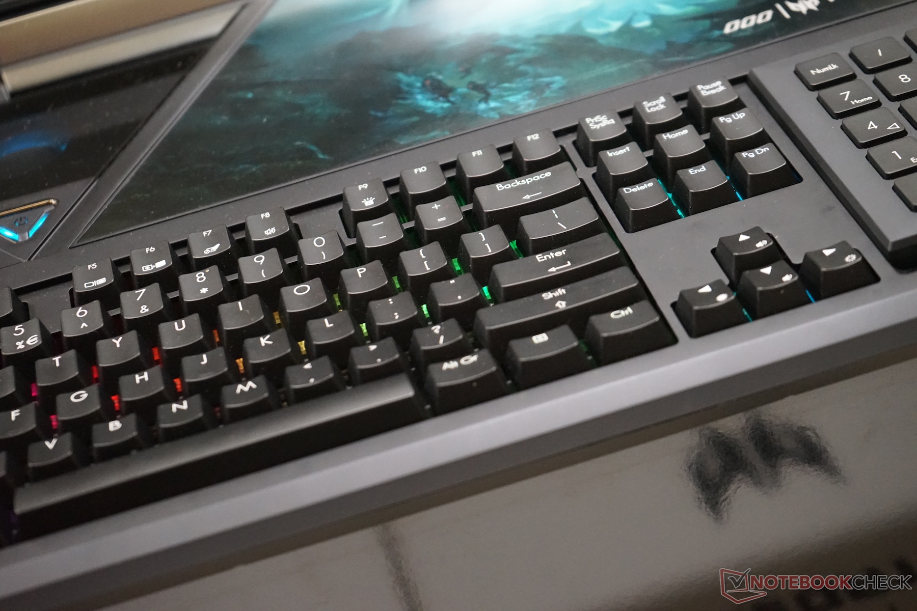 Das Acer Predator 21X bietet eine Tastatur mit mechanischen Cherry-MX-Switches. Jese Taste lässt sich individuell durch RGB-LEDs beleuchten. Weiteres Highlight ist der Tastenblock, der sich entnehmen und umdrehen lässt. Auf der Rückseite befindet sich ein Touchpad.