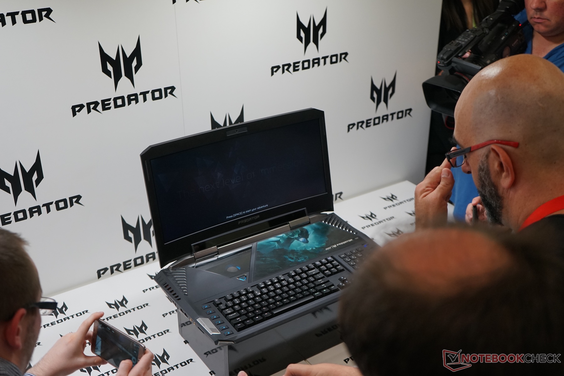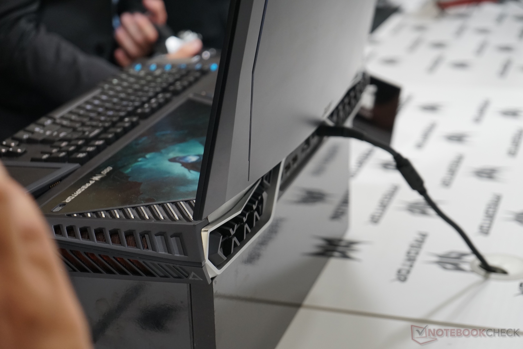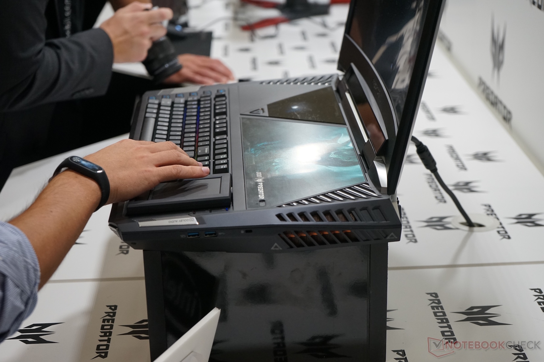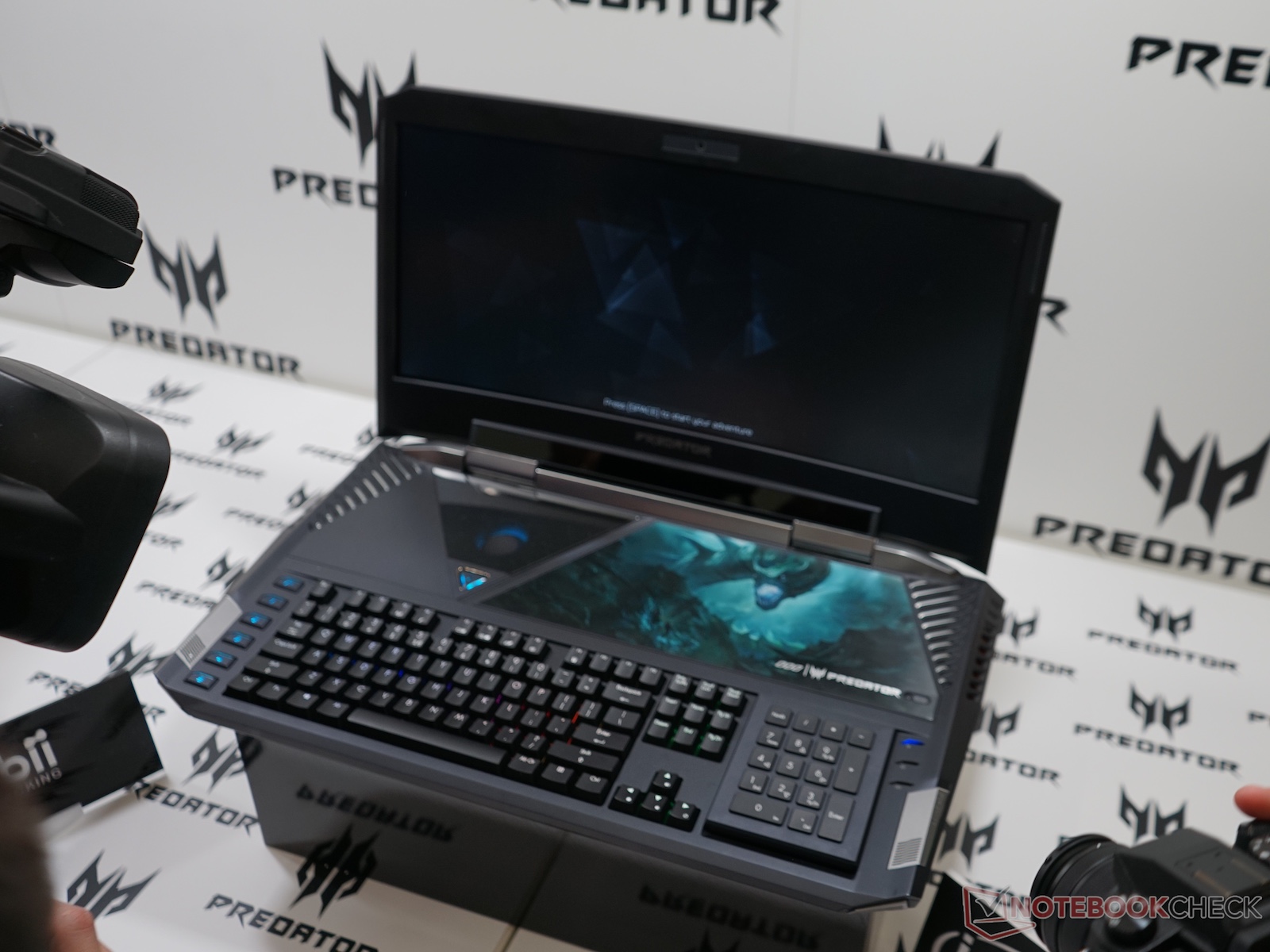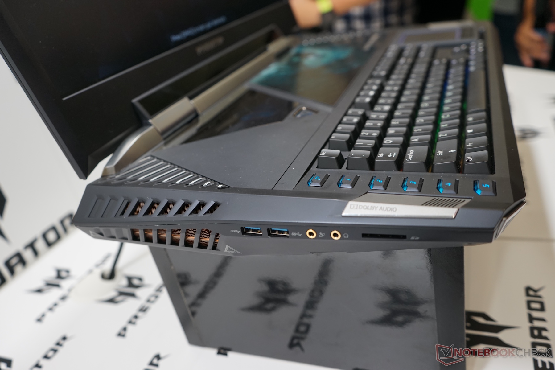 Wir konnten direkt vor Ort mit Acer-Mitarbeitern sprechen und uns das Gerät anschauen. Dabei konnten wir erfahren, dass zur Speicherausstattung noch nichts feststeht. Eine Möglichkeit wäre, dass 2 SSDs und 2 HDDs verbaut werden könnten. Per Klappe oberhalb der Tastatur kann mit einem Torx-Schraubenzieher an RAM und Festplatten gelangen. Das Gewicht des Acer Predator 21X wird wohl um die 7 Kilogramm betragen. Unten finden Sie ein erstes Video und einige Bilder direkt vom Stand auf der IFA.