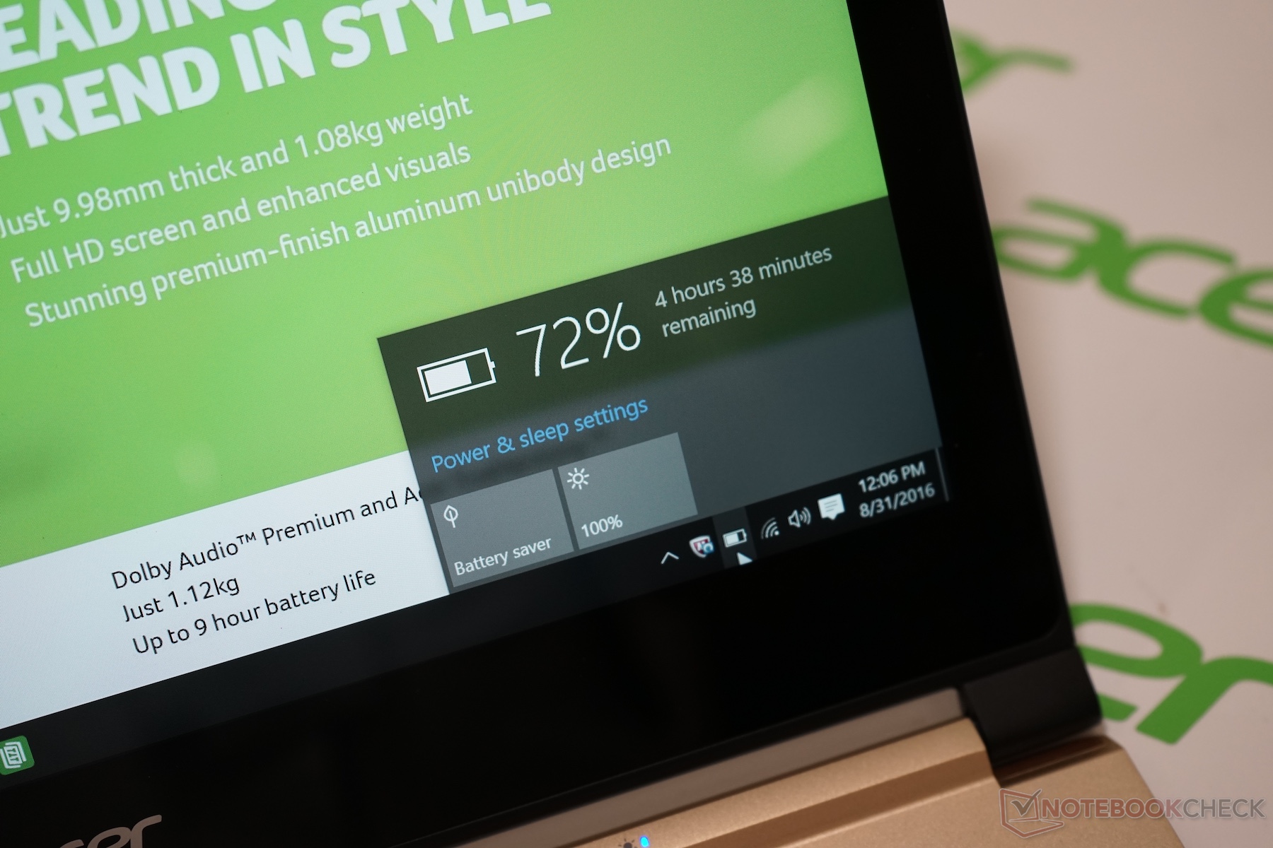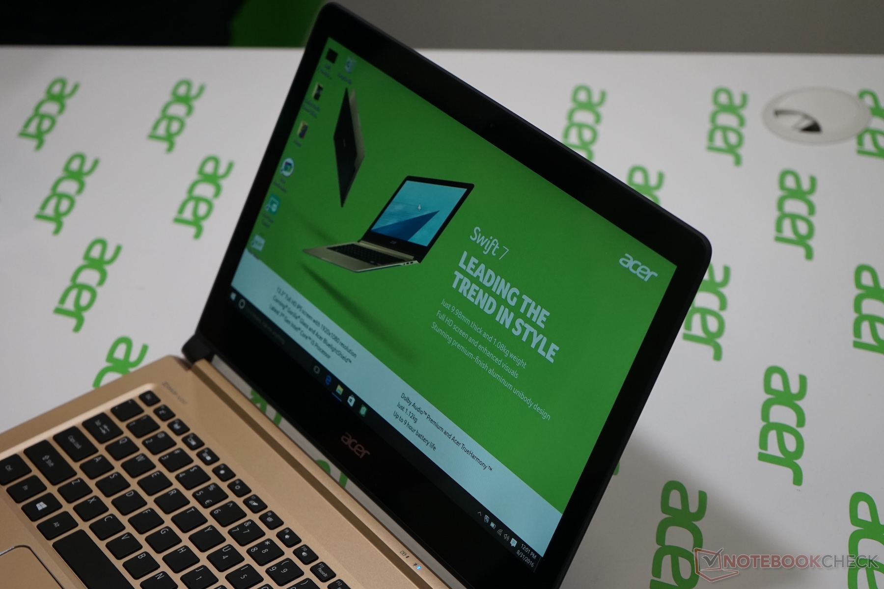 Anbei einige Impressionen des Acer Swift 7 von der Pressekonferenz auf der IFA 2016. Auf einem der Fotos sind auch die detaillierten Spezifikationen des Ausstellungsgeräts mit Core m7-7Y75, Kingston 256 GB SSD und Qualcomm Wifi.