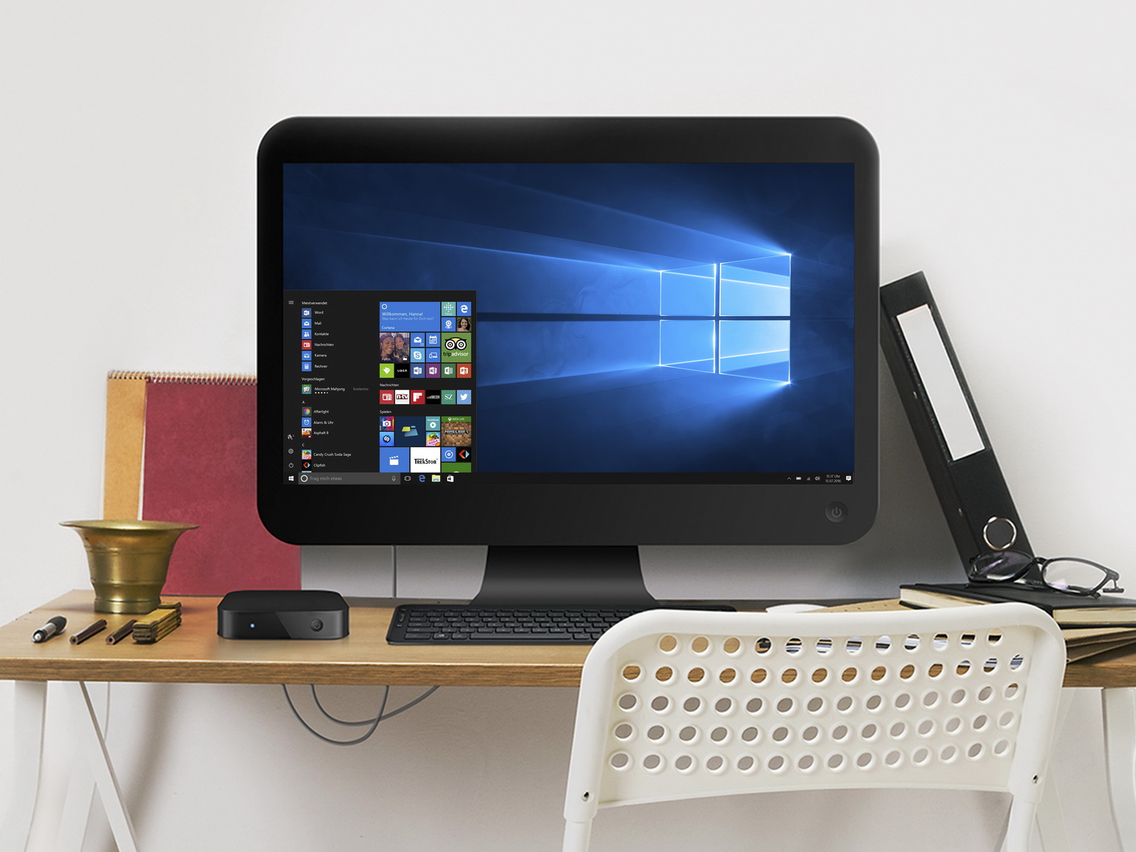 Im Inneren des Mini-PC arbeitet ein Intel Atom x5-Z8300 Prozessor zusammen mit 2 GB Arbeitsspeicher und Windows 10 Home. Wahlweise lassen sich per USB 3.0, USB 2.0 und micro-USB-2.0 mit Host-Funktion externe Helfer wie Tastatur, Maus oder Festplatte anschließen. Zur schnellen Verbindung steht neben WLAN auch ein Ethernet-Anschluss zur Verfügung. Dank der passiven Kühlung bleibt der Mini-PC geräuschlos.