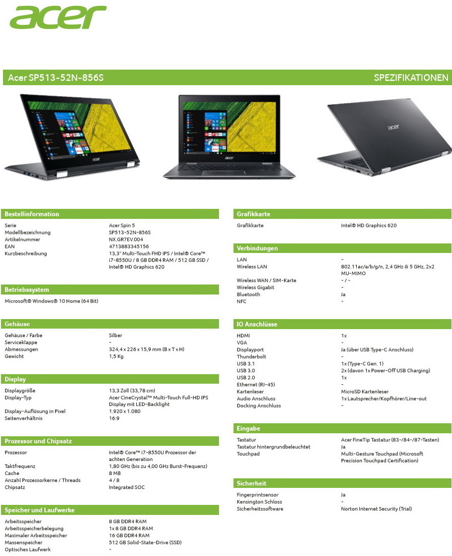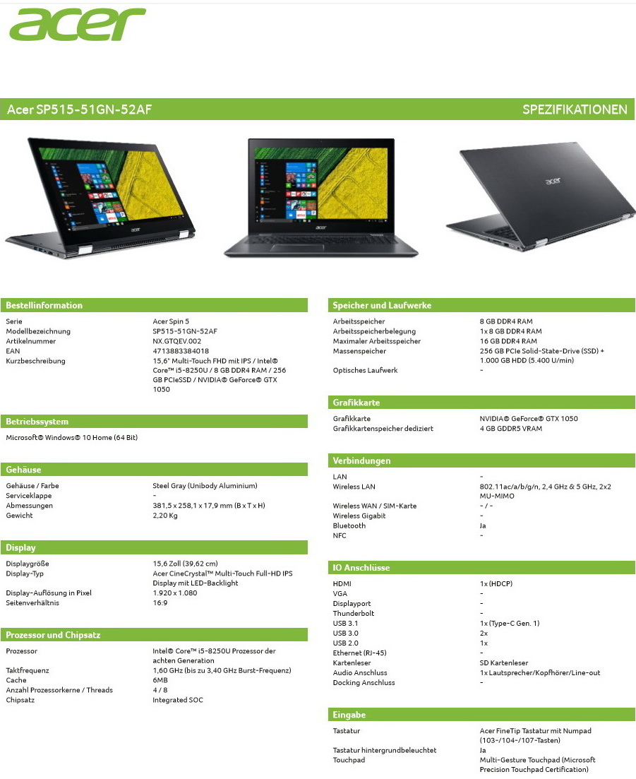 Das 13,3 Zoll große Modell bringt es auf ein Gewicht von 1,5 Kilo und ist 15,9 mm dünn. Die 15,6-Zoll-Variante wiegt hingegen 2,2 kg und ist 17,9 mm flach. Als Speicher sind bis zu 16 GB DDR4-RAM sowie SSDs mit 256 GB oder 512 GB verfügbar. In den 15,6-Zoll-Modellen SP515-51GN-52AF (Core i5-8250U) sowie SP515-51GN-80A3 (Core i7-8550U) ist zudem jeweils eine Nvidia GeForce GTX 1050 mit 4 GB DDR5 VRAM eingebaut. Die Full-HD-Multitouch-Displays der Spin-5-Serie unterstützten den Acer Active Pen mit 1.024-stufiger Druckempfindlichkeit mit Windows Ink.