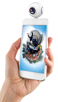 Auf der IFA 2017 zeigt Easypix mit der Omini 360° eine Aufsteckkamera fürs Smartphone, mit der sich 360-Grad-Aufnahmen machen lassen. Die 42 x 41 x 41 Millimeter große kugelförmige Kamera wird mit dem Smartphone durch Anstecken am micro-USB- oder USB-Typ-C-Anschluss des Android-Smartphones verbunden. So erhält die 360-Grad-Kamera auch Strom.