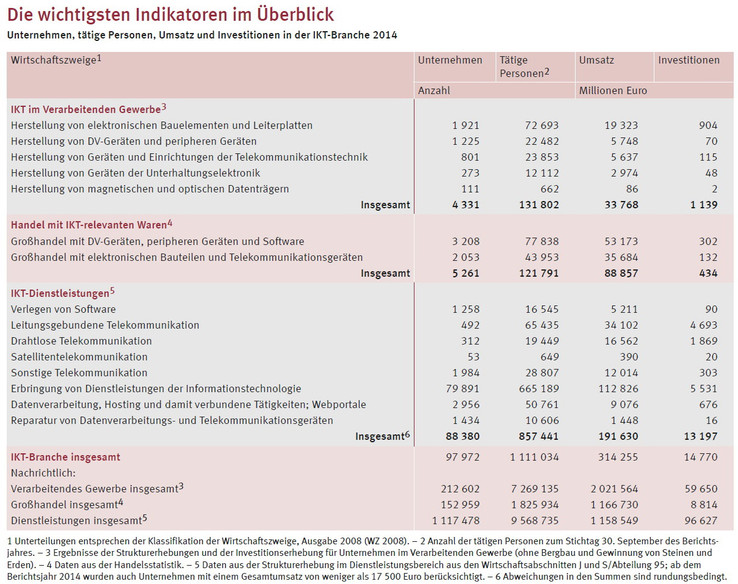 Die IKT-Branche umfasste im Jahr 2014 rund 98.000 Unternehmen mit etwa 1,1 Millionen tätigen Personen. Mit rund 84.000 Unternehmen war der überwiegende Teil der Unternehmen dem Dienstleistungssektor zuzuordnen (90,2 Prozent). Die Investitionen in der IKT-Branche lagen im Jahr 2014 nahezu unverändert bei 14,8 Milliarden Euro.