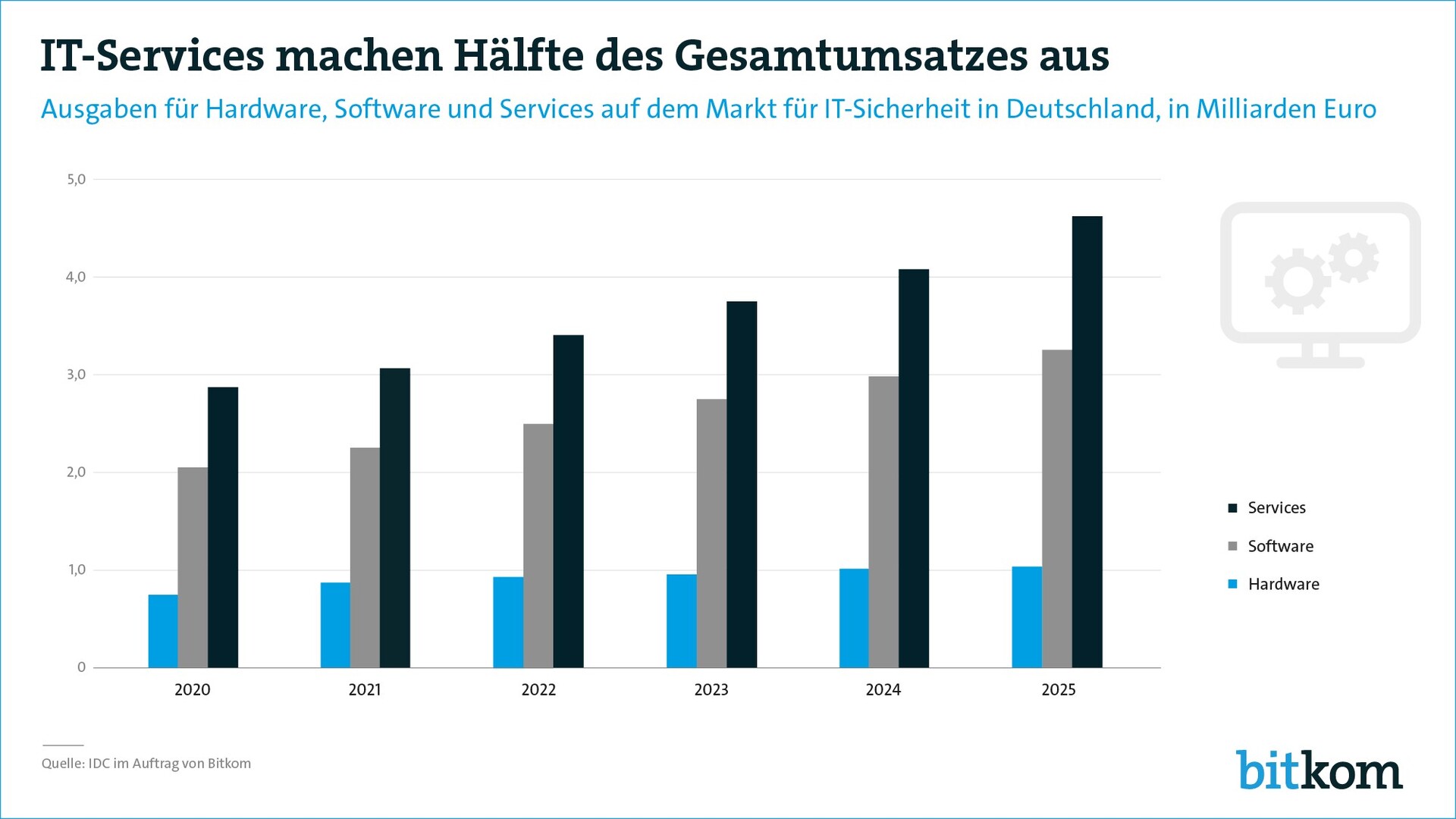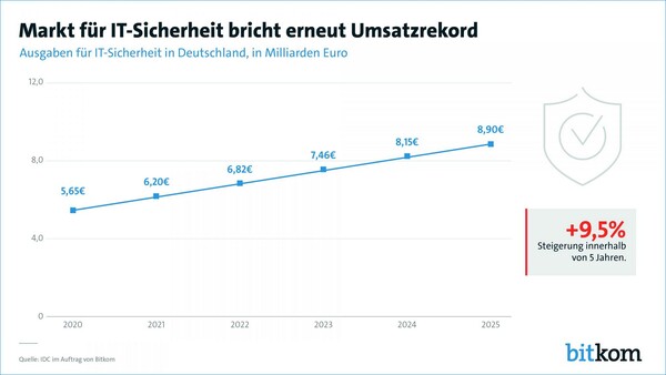 Das Wachstum für den Sektor IT-Sicherheit in Deutschland soll sich auch in den kommenden Jahren weiter rasant entwickeln: Für das Jahr 2022 beläuft sich die Prognose für ein weiteres Umsatzplus auf 6,8 Milliarden Euro (+9,9 Prozent). Der Bitkom geht davon aus, dass der IT-Sicherheitsmarkt pro Jahr mit einem durchschnittlichen Wachstum von 9,5 Prozent dann 2025 rund 8,9 Milliarden Euro Umsatz mit IT-Security-Lösungen erzielt.