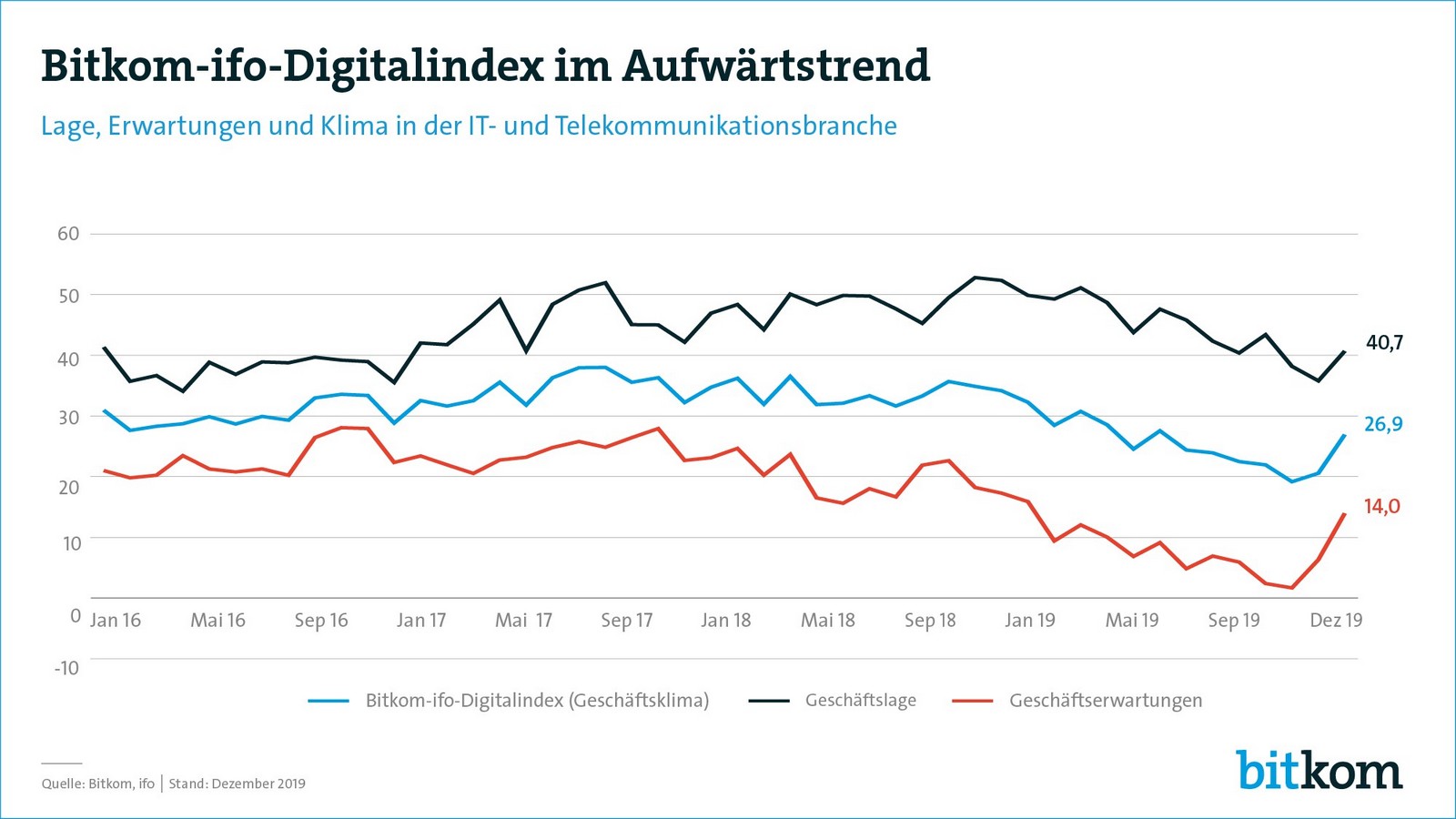 Auch bei den Arbeitsplätzen bleibt die ITK-Branche ein wichtiger Jobmotor. Bis zum Jahresende werden die ITK-Unternehmen in Deutschland voraussichtlich 39.000 zusätzliche Jobs schaffen. Damit wären erstmals mehr als 1,2 Millionen Menschen in der ITK-Branche beschäftigt. Mit 26,9 Punkten kletterte der Bitkom-ifo-Digitalindex im Dezember zudem auf den höchsten Stand seit Mai 2019.