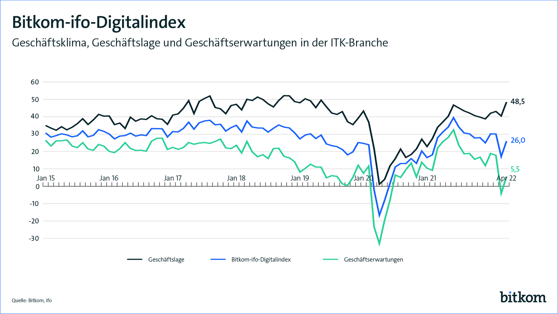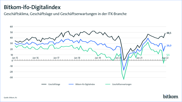 Die Folgen des Ukrainekriegs, Sanktionen und steigende Energiepreisen drücken in der Gesamtwirtschaft allerdings doch auf die Stimmung. Laut Bitkom zeigt sich das ifo-Geschäftsklima mit plus 2,3 Punkte freundlicher und zieht mit 0,7 Punkten wieder ins Plus. Die Geschäftslage bleibe bei 21,5 Punkten (+0,3) nahezu konstant, so der Branchenverband. Die Erwartungen steigen um 3,9 Punkte, liegen mit -18,2 Punkten aber weiter deutlich im negativen Bereich.