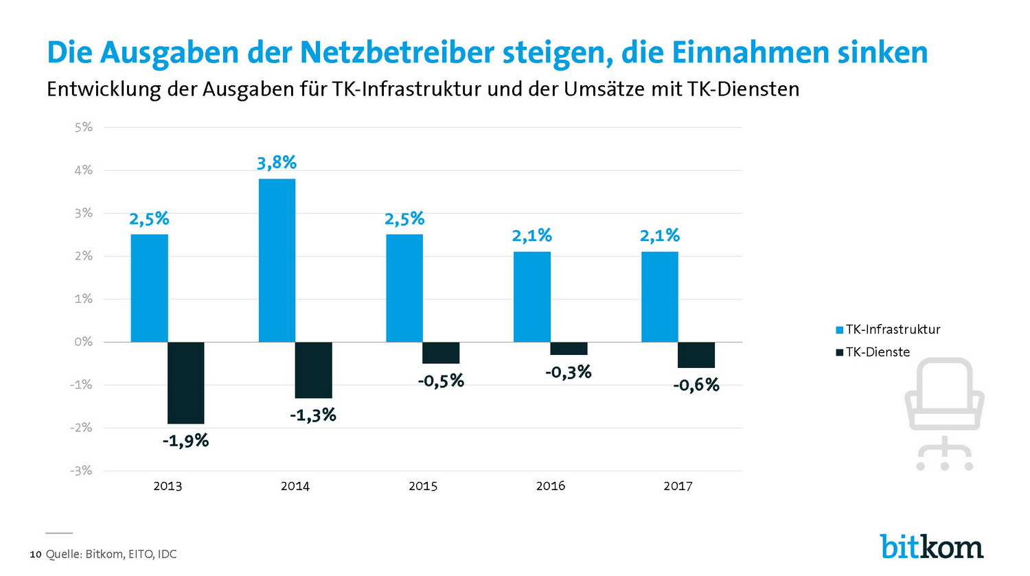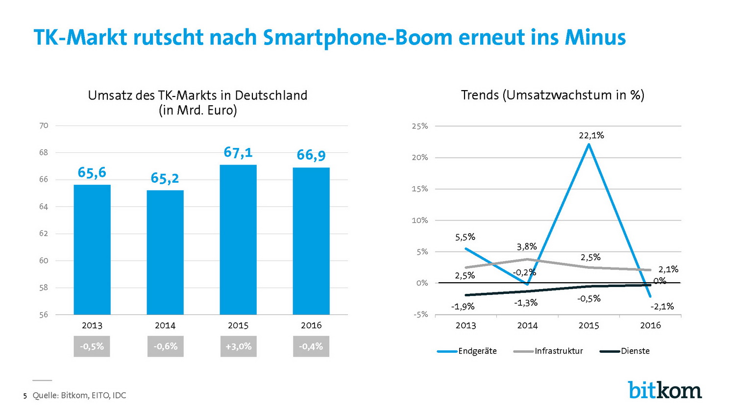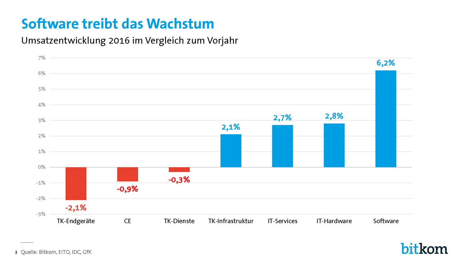 Abwärtstrend: Für die Telekommunikation erwartet der Bitkom, dass die Umsätze um 0,4 Prozent auf 66,9 Milliarden Euro zurückgehen. Das Geschäft mit TK-Endgeräten wird um 2,1 Prozent auf 11,1 Milliarden Euro abflauen. In der Unterhaltungselektronik sinken die Umsätze nur mehr geringfügig um 0,9 Prozent auf 9,5 Milliarden Euro. Für 2017 erwartet der Bitkom für den ITK-Gesamtmarkt ein Plus von 1,2 Prozent auf 162,4 Mrd. Euro.