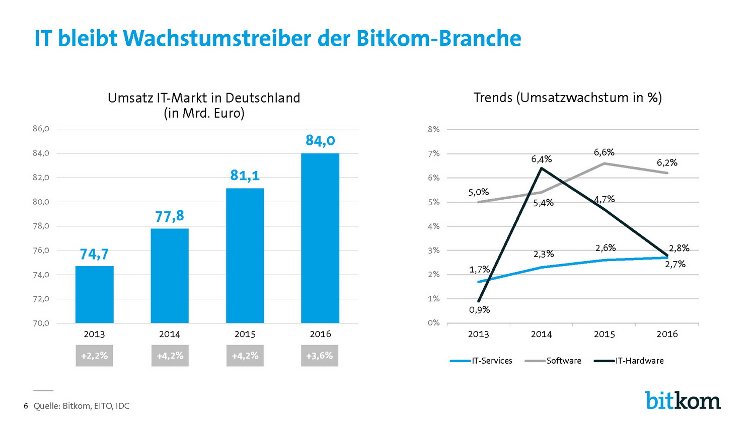 Überdurchschnittlich wachsen vor allem die Geschäfte der Softwareanbieter. Hier rechnet der Bitkom mit einem Plus von 6,2 Prozent auf 21,6 Milliarden Euro. Dem Bereich IT-Services traut der Branchenverband einen Umsatzanstieg um 2,7 Prozent auf 38,2 Milliarden Euro zu. IT-Hardware legt um 2,8 Prozent auf 24,3 Milliarden Euro zu.