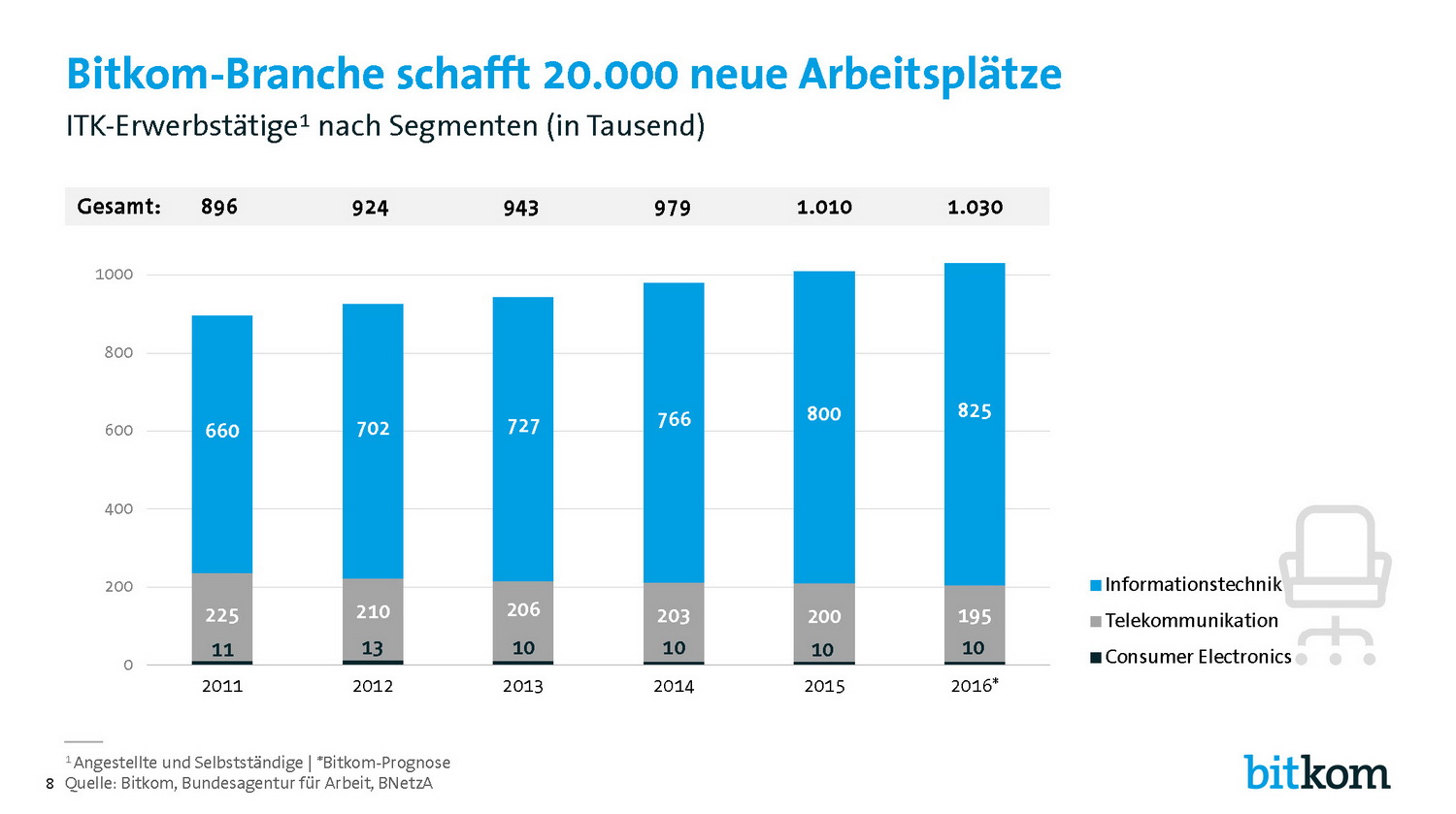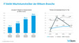 Laut dem Bitkom arbeiten demnach in Deutschland in der ITK-Branche zum Jahresende 1,03 Millionen Menschen. Die ITK-Branche bleibt damit der zweitgrößte industrielle Arbeitgeber in Deutschland, knapp hinter dem Maschinenbau. Wachstumstreiber ist derzeit die Informationstechnologie, die dem Bitkom zufolge in diesem Jahr um 3,6 Prozent auf 84 Milliarden Euro zulegen dürfte.