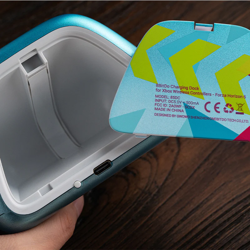 Das 8BitDo Charging Dock für Xbox Wireless Controller in der Forza Horizon 6 Limited Edition ist in Zusammenarbeit mit Xbox und Forza Horizon 6 entstanden. Die Ladestation ist für Controller der Xbox Series X/S ausgelegt und besitzt drei Pogo-Pins zum Aufladen sowie zwei Magnete, damit der Controller sicher in Position bleibt. Außerdem gibt es ein Aufbewahrungsfach für Ersatzakkus, Batteriefächer und kleines Zubehör.
