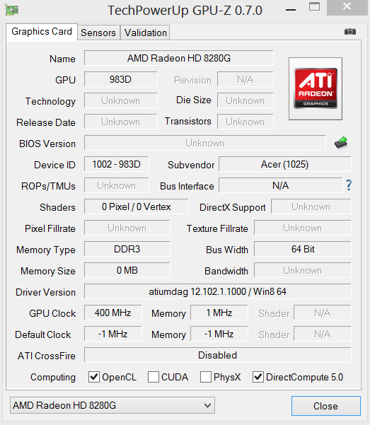 - Radeon HD 8250, 128 GCN-Shader bei 300 - 400 MHz, Treiber 12.102.1.1000