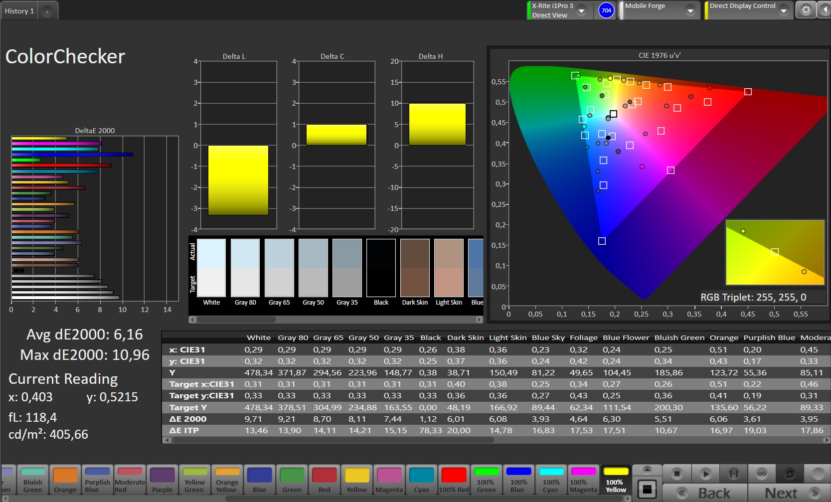 | Delta E Colorchecker * | 6.16 | 1.56 75% | 2.48 60% | 2.96 52% | 2.7 56% | 2.6 58% |