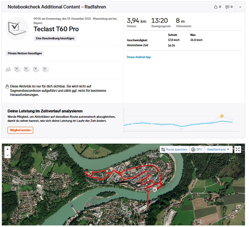 Unsere Position wird mit dem T60 Plus zwar nicht immer perfekt wiedergeben, die Abweichungen zur Wegstrecke sind aber als gering einzustufen. Die zu Vergleichszwecken genutzte Garmin Venu 2 liefert größtenteils ähnliche Ergebnisse wie das Teclast-Tablet.