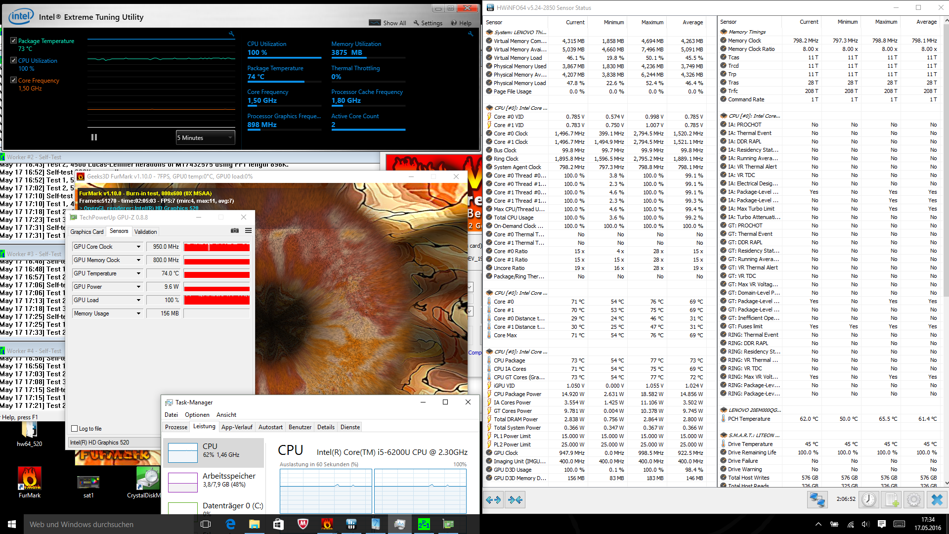 Um das System maximal auszulasten und die Stabilität zu überprüfen, nutzen wir die Tools Prime95 sowie FurMark. Diese unrealistischen Konditionen repräsentieren nicht die alltägliche Belastung, sondern belasten den Prozessor und die Grafikkarte zu 100 Prozent.