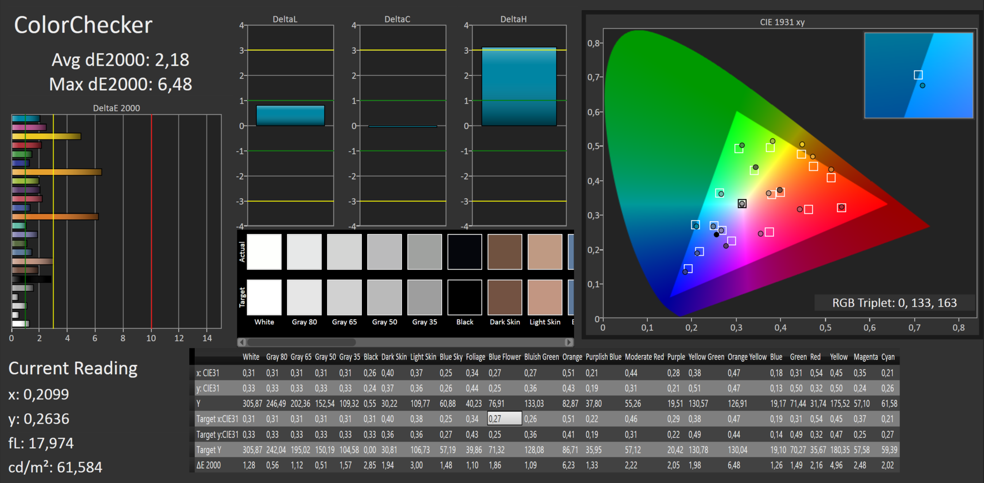 | Colorchecker dE 2000 max. * | 6.48 | 11.89 | 12.72 |