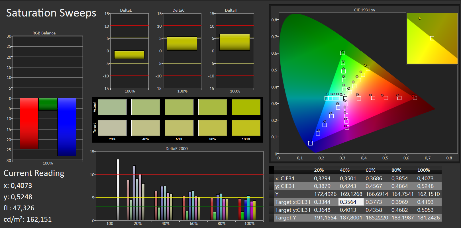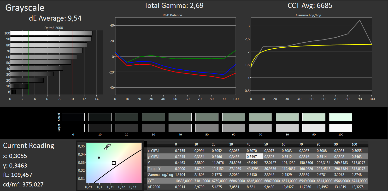 | Delta E Graustufen * | 2.35 | 4.62 | 9.54 |