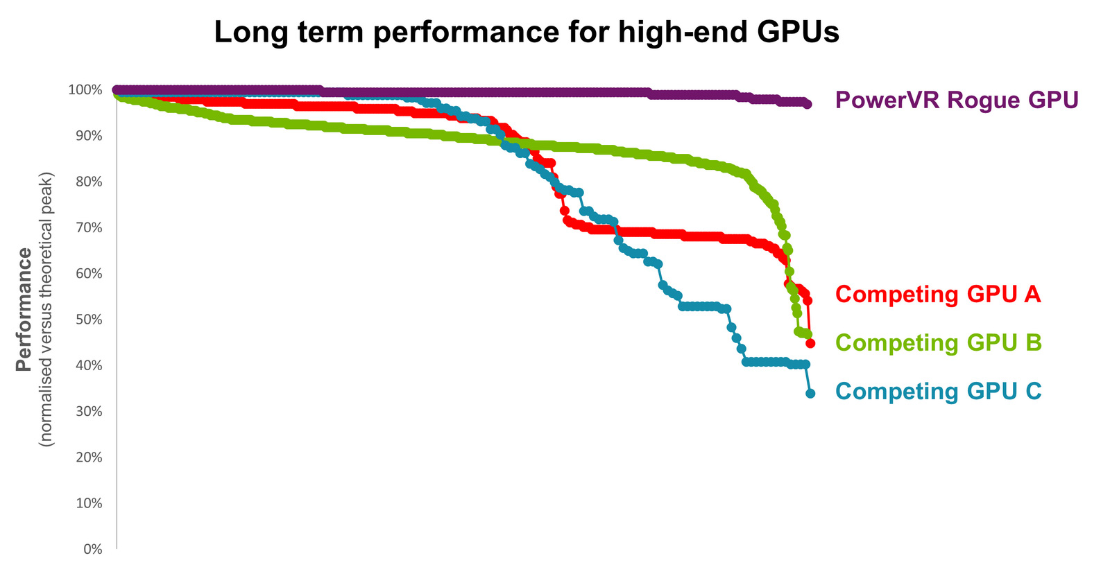 Im Vergleich zu der im letzten Jahr vorgestellten PowerVR GX6650 mit 192 FP32-ALUs rechnet die PowerVR GT7900 nun mit 16 Unified-Shading-Clustern (USC) und 512 ALU Cores. Auch der Nvidia K1 besitzt beispielsweise 192 CUDA Cores. Laut Imagination erreicht die GT7900 bis zu 800 GFLOPS (FP32) oder 1,6 TFLOPS (FP16) bei 800 MHz. Zum Vergleich: Eine Nvidia Tegra X1 reiht sich bei etwa 512 GFLOPS (FP32) ein, eine GeForce 840M (GM108) rangiert bei etwa 790 GFLOPS.