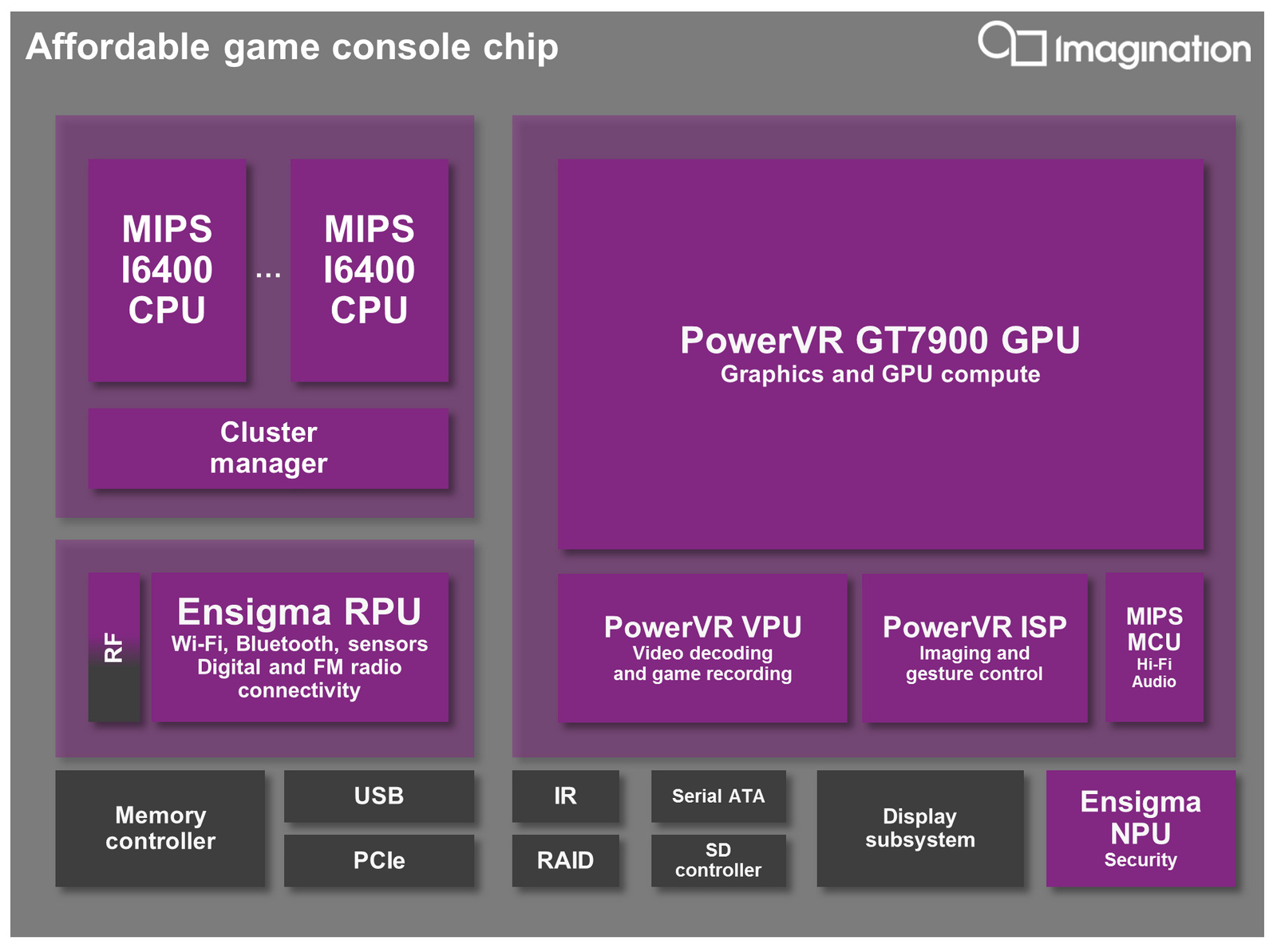 Als wichtigste weitere Verbesserungen, neben der gesteigerten Energieeffizienz seiner neuen Power-GPU PowerVR GT7900, nennt Imagination die volle Unterstützung von OpenGL ES 3.1 + AEP (Android Extension Pack) inklusive Hardware-Tessellation, ASTC LDR und HDR Texturkompression sowie Hardware-Virtualisierung auf GPU- und CPU-Ebene, was eine parallele Nutzung verschiedener Betriebssysteme auf einer Hardwareplattform sprich Gerät erlaubt.