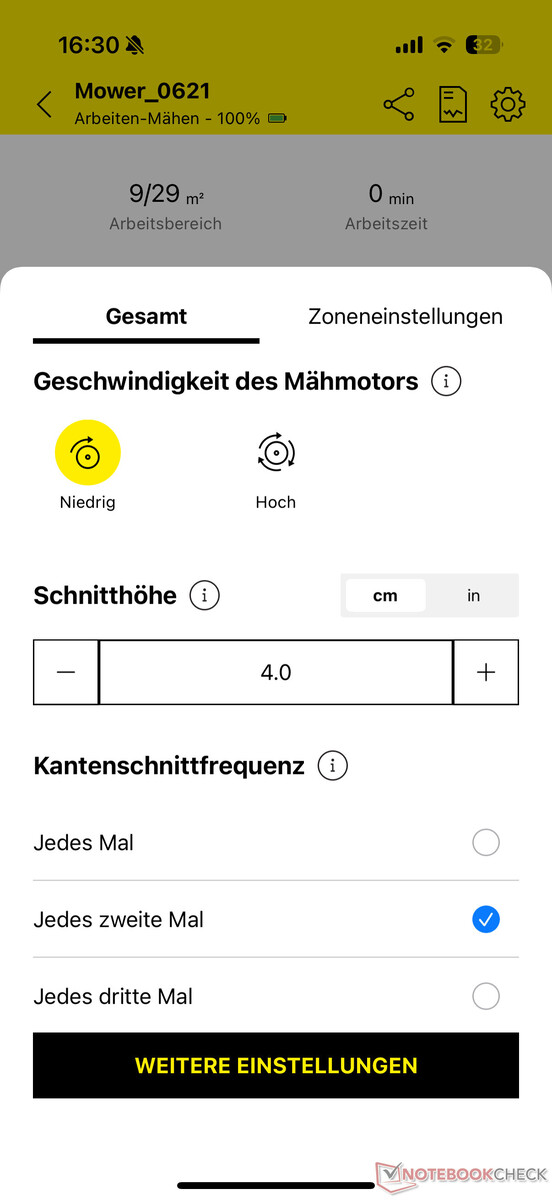 Das Zahnrad-Icon oben rechts ruft die Einstellungen auf. Hier stehen allerhand Optionen für den Bahnversatz (Akkurat, Ausgewogen, Effizient), die Mähgeschwindigkeit (Langsam, Normal, Schnell), die Schnittrichtung (Standard, Wechselnd, Individuell) und die Geschwindigkeit des Mähmotors (Niedrig, Hoch) parat.