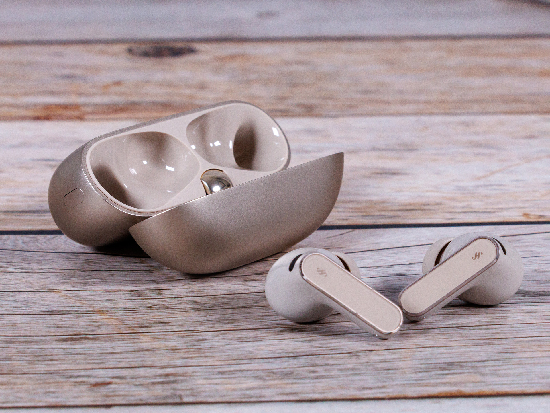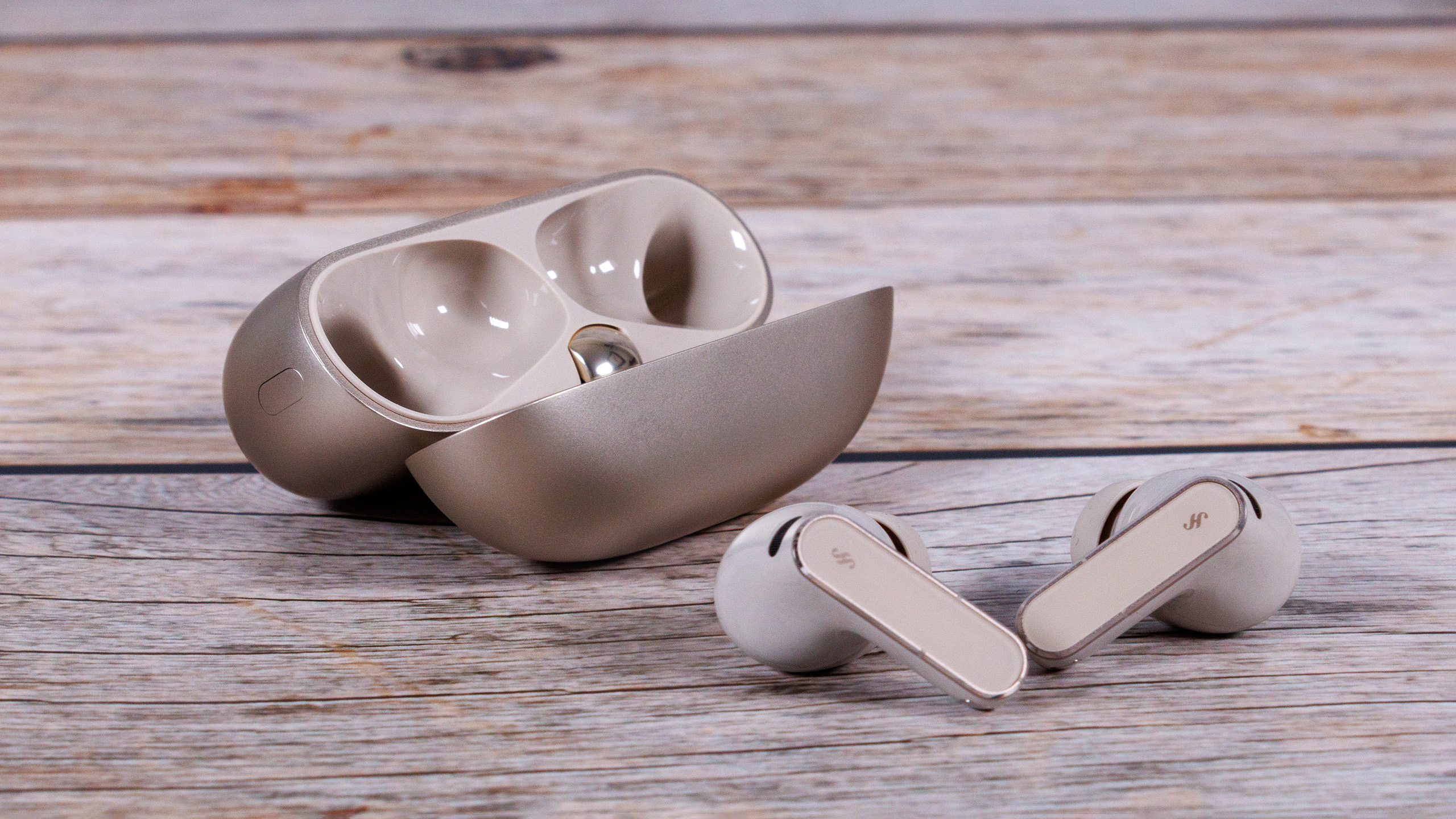 Die Huawei FreeBuds Pro 5 sind etwas kompakter und runder als ihre Vorgänger und die Ohrhörer wiegen 0,3 Gramm weniger. Das Ladeetui wird ebenfalls 4 Gramm leichter, es sei denn, die Entscheidung fällt zu Gunsten der blauen Variante, dann ist es nur ein Gramm. Als Farbvarianten stehen Weiß, Schwarz, Sandgold (unser Testgerät) sowie Dunkelblau zur Wahl. Bei letzterem ist das Case mit einer strukturierten Kunstlederschicht ummantelt.
