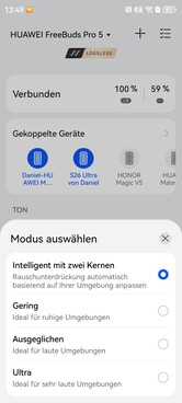 Der Klang ist aber auch mit LDAC richtig gut und wurde insbesondere im Bass- und Mittenbereich nochmals hörbar verbessert. Auch bei der aktiven Geräuschunterdrückung (ANC) hat Huawei nachgebessert und dämpft Umgebungslärm noch besser, liegt aber nicht ganz auf dem Niveau von Apples AirPods Pro 3. Der Transparenzmodus präsentiert sich sowohl klar als auch rauscharm und wird auch aktiviert, wenn ein Ohrhörer herausgenommen wird.
