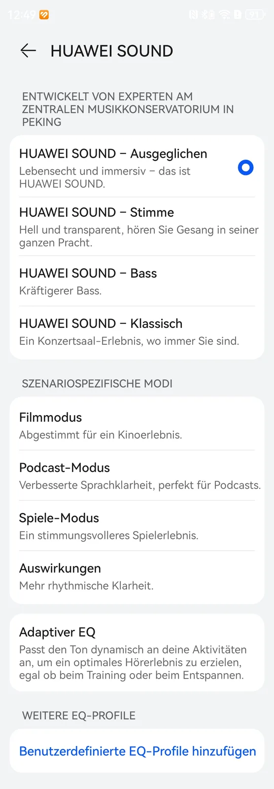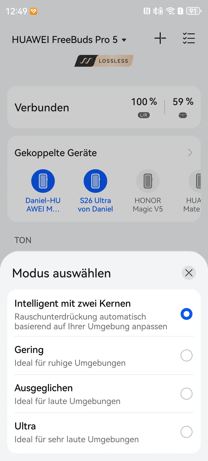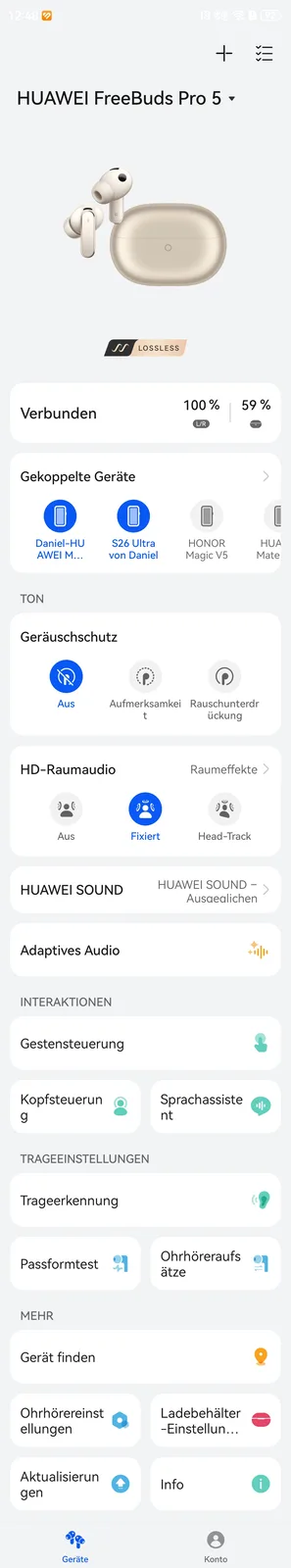 In der App lassen sich unter anderem die gekoppelten Geräte verwalten, Updates einspielen, Equalizer definieren, räumliches Audio einstellen und einiges mehr. Für Apple steht der AAC-Codec bereit, während Android-Geräte auf LDAC zurückgreifen können. Wer im Besitzt eines Huawei Smartphones oder Tablets ist, dem steht auch Lossless-Streaming zur Verfügung, bei den aktuellen Produkten gelingt dies dann mit bis zu 2,3 MBit/s. Wer jedoch ein Vorjahresgerät besitzt, muss sich plötzlich mit L2HC 3.0 beziehungsweise 1,5 MBit/s begnügen. Dies betrifft unter anderem das Pura 70 Ultra oder das Mate XT, welche die FreeBuds Pro 4 noch mit 2,3 MBit/s nutzen konnten. Warum Huawei seine eigenen Produkte hier künstlich verschlechtert, bleibt uns schleierhaft.