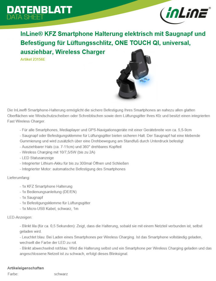 Als kabelfreie Energietanke lädt die InLine One Touch Qi den Smartphone-Akku während der Fahrt. Die Auflagefläche der Halterung unterstützt den induktiven Ladestandard Qi mit einer Leistung von bis zu 10 Watt. Laut Intos lassen sich zum Qi-Standard kompatible Mobiltelefone mit 10, 7,5 oder 5 Watt und bis zu 2 Ampere aufladen. Eine LED-Statusanzeige informiert über den Ladestatus von Halterung und Phone.