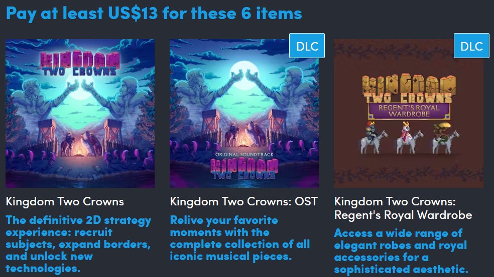 In der dritten Stufe kommen zwei zusätzliche Erweiterungen für Kingdom Two Crowns hinzu. Kingdom Two Crowns – Call of Olympus erweitert das Spiel um neue Inseln, Reittiere, Artefakte und Herausforderungen. Auf Steam kostet das DLC regulär 9,99 Euro. Kingdom Two Crowns – Norse Lands führt ein neues nordisches Königreich ein, das zusätzliche Gebiete zum Erkunden, neue Haustiere und weitere Inhalte bietet. Es kostet normalerweise 6,99 Euro.