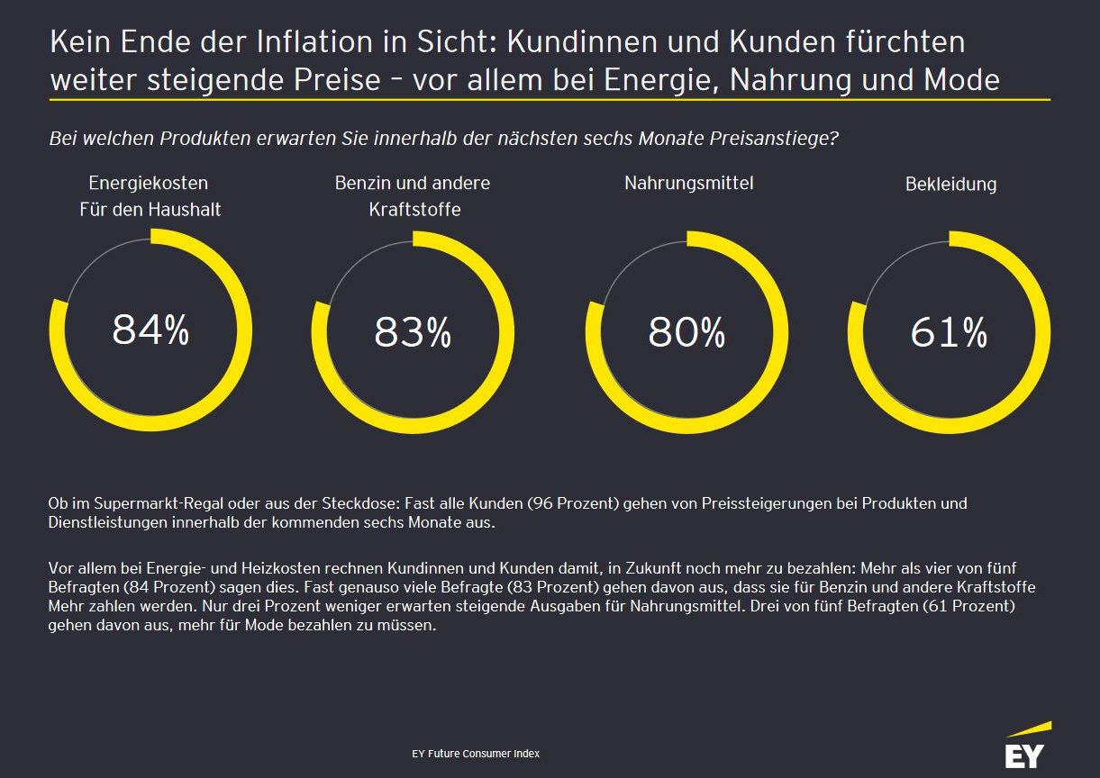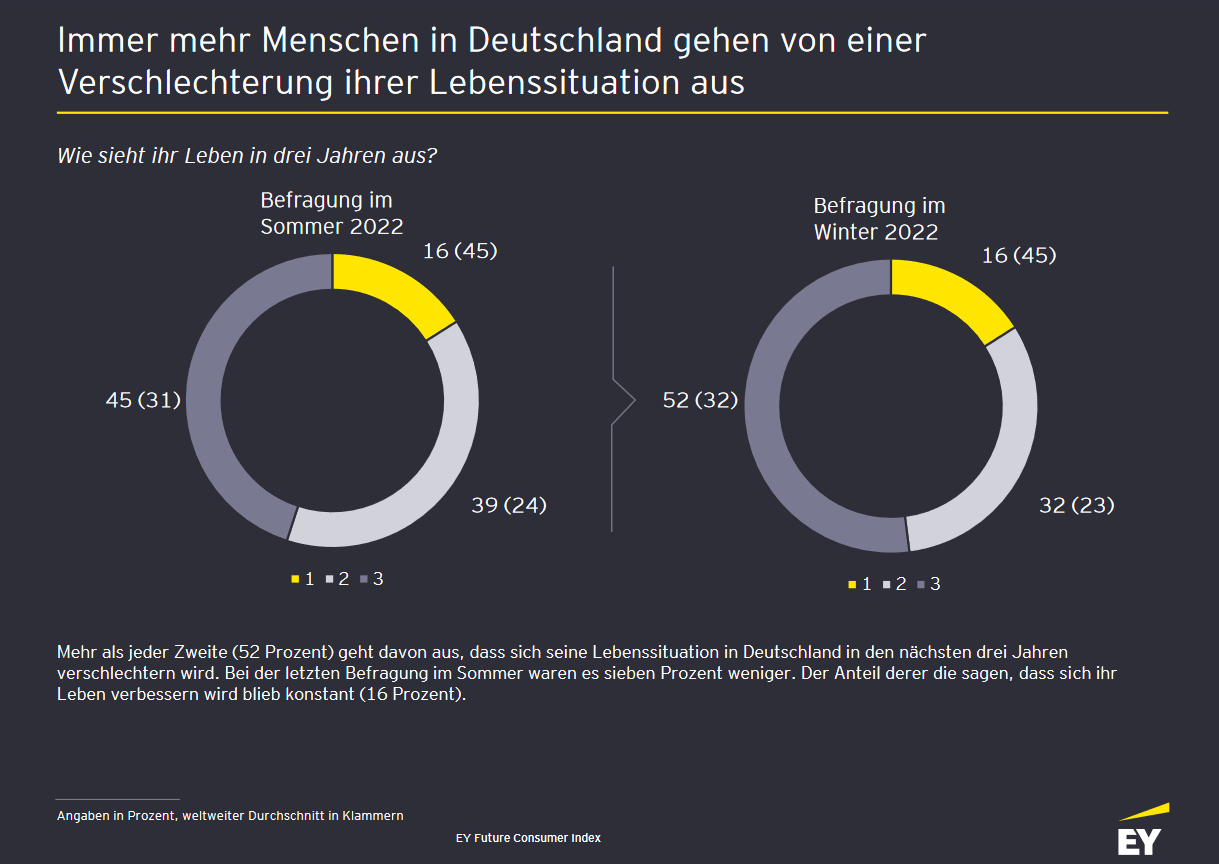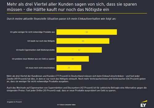 In der aktuellen Verbraucherumfrage gaben immerhin mehr als drei Viertel (77 Prozent) der Konsumenten an, sich beim Einkaufen wegen der schlechten finanziellen Situation einschränken zu müssen. Laut der EY-Umfrage sparen Kundinnen und Kunden in Deutschland vor allem bei Bekleidung, Unterhaltungselektronik und Benzin. Schlecht für Hersteller und den Handel: mehr als die Hälfte der Konsumenten in Deutschland erwartet in naher Zukunft eine Verschlechterung der Lebenssituation.