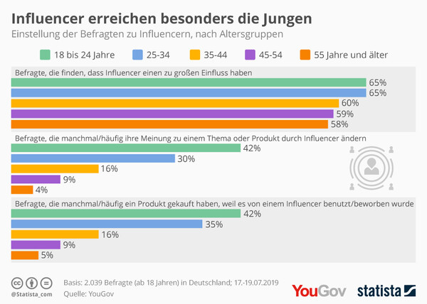 Wie eine repräsentative Umfrage von YouGov zu diesem Thema ergab, finden immerhin zwei von drei Befragten (60 Prozent), dass InfluencerInnen in Deutschland mittlerweile einen zu großen Einfluss haben. Überraschend: Besonders die Befragten zwischen 18 und 34 Jahren sind in der überwiegenden Mehrheit der Ansicht, dass Influencer und Influencerinnen einen zu großen Einfluss ausüben (65 Prozent).