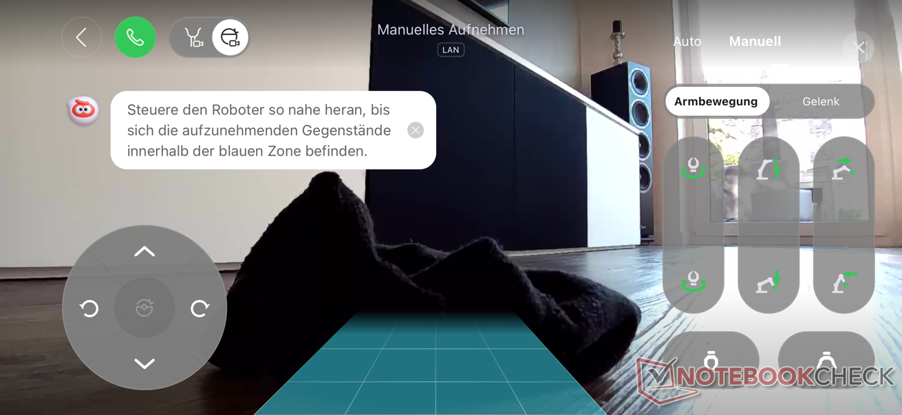 Über diesen lässt sich der Arm auch manuell steuern - samt Live-Video. Wobei die Möglichkeiten doch recht begrenzt erscheinen, da die Steuerung durchaus etwas Übung bedarf und die Bewegungen des Arms recht langsam sind. Damit beispielsweise ein Spielzeug für ein Haustier aus der Ferne gesteuert zu werfen, kommt auf jeden Fall schon mal nicht infrage. :-) Es macht aber dennoch zumindest kurzweilig Spaß, auch manuell das Zuhause per ferngesteuertem Roboter aufzuräumen.