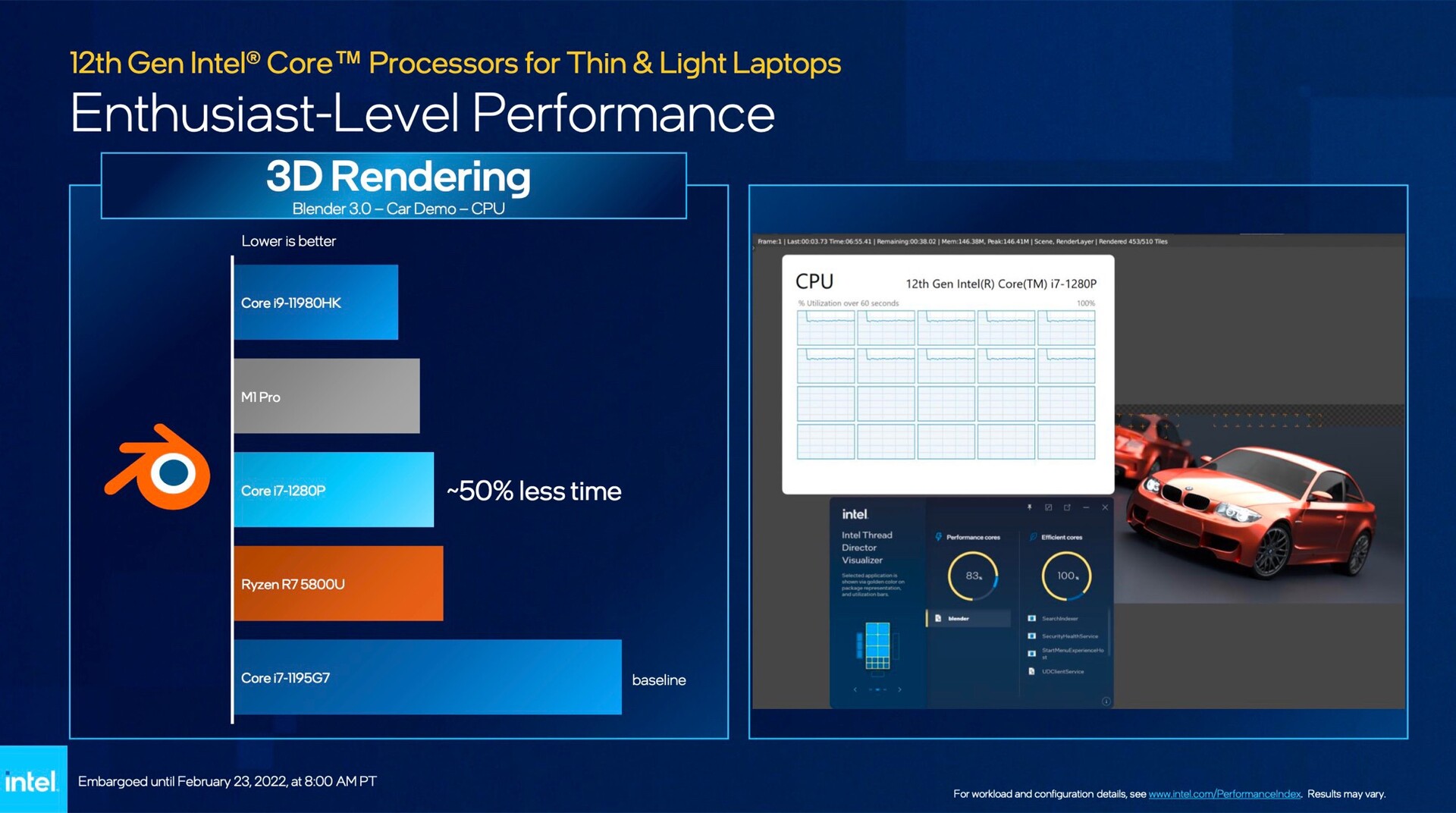 Mithilfe von Blender 3.0 will Intel zeigen, dass der Core i7-1280P doppelt so schnell arbeitet wie der Core i7-1195G7, beide Chips wurden dabei mit 35 Watt betrieben. Der Apple M1 Pro ist in diesem Benchmark aber schneller als der Flaggschiff-Prozessor der Alder Lake-P-Serie, der Ryzen 7 5800U kann nur knapp übertroffen werden.