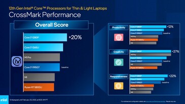 Immerhin verspricht Intel bei PugetBench und CrossMark einen deutlichen Vorsprung von teils über 30 Prozent gegen den Apple M1 Pro und den Ryzen 7 5800U, da Intel allerdings nur Balken zeigt und keine konkreten Daten nennt sind diese Benchmarks nur begrenzt aussagekräftig.