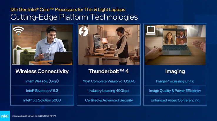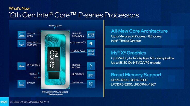 Genau wie auch Alder Lake-U unterstützen die Prozessoren bis zu vier 4K-Monitore, zwei PCIe Gen 4-SSDs, viermal Thunderbolt 4 und eine breite Auswahl an Arbeitsspeicher, inklusive DDR5-4800, LPDDR5-5200, DDR4-3200 und LPDDR4x-4267.