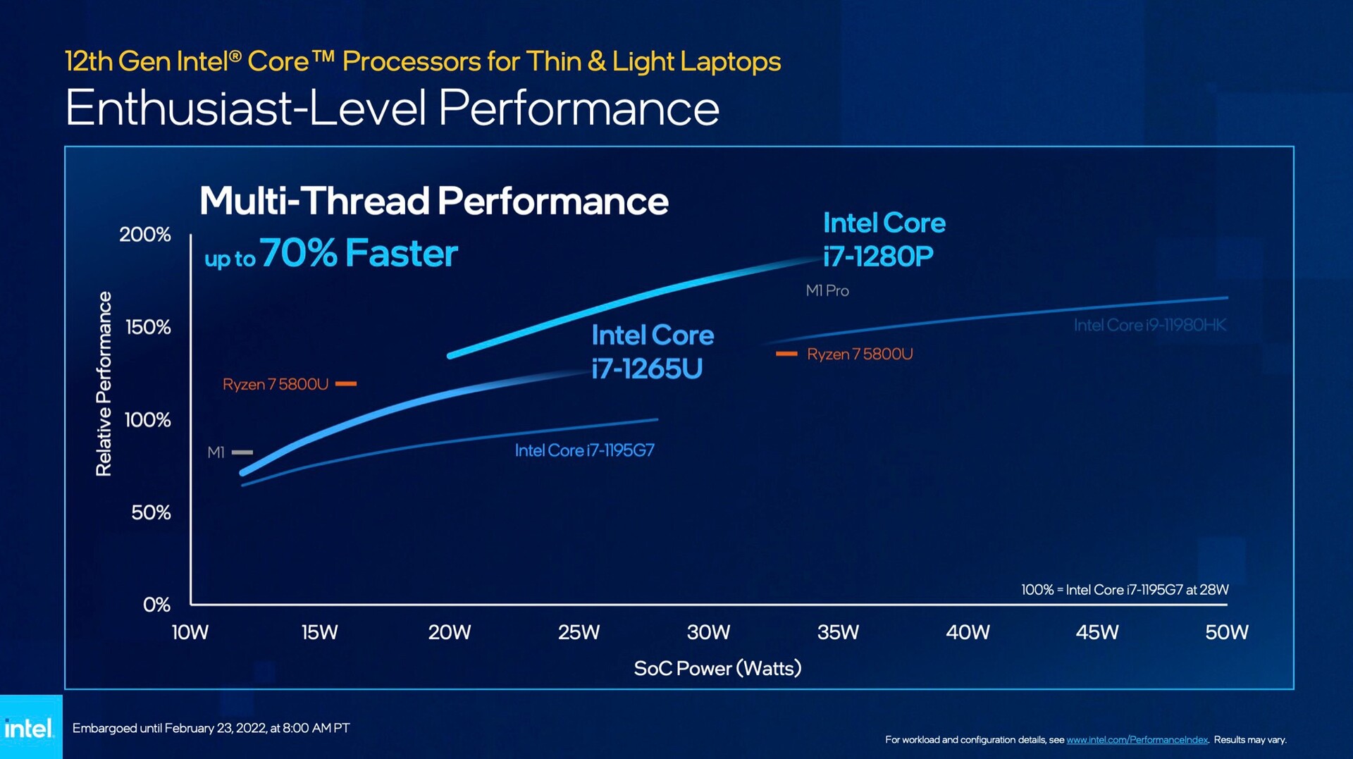 Nachdem AMD Ryzen 6000 Mobile vor allem eine bessere Effizienz im Vergleich zu Intel bieten sollte ist der unten eingebettete Benchmark-Vergleich besonders spannend. Demnach arbeitet der Core i7-1280P mit seiner PBP von 28 Watt und den zusätzlichen Performance-Kernen deutlich effizienter als der Core i7-1265U, bei einem tatsächlichen Verbrauch von 35 Watt soll der Prozessor eine deutlich bessere Performance als der AMD Ryzen 7 5800U und der Apple M1 Pro erzielen.