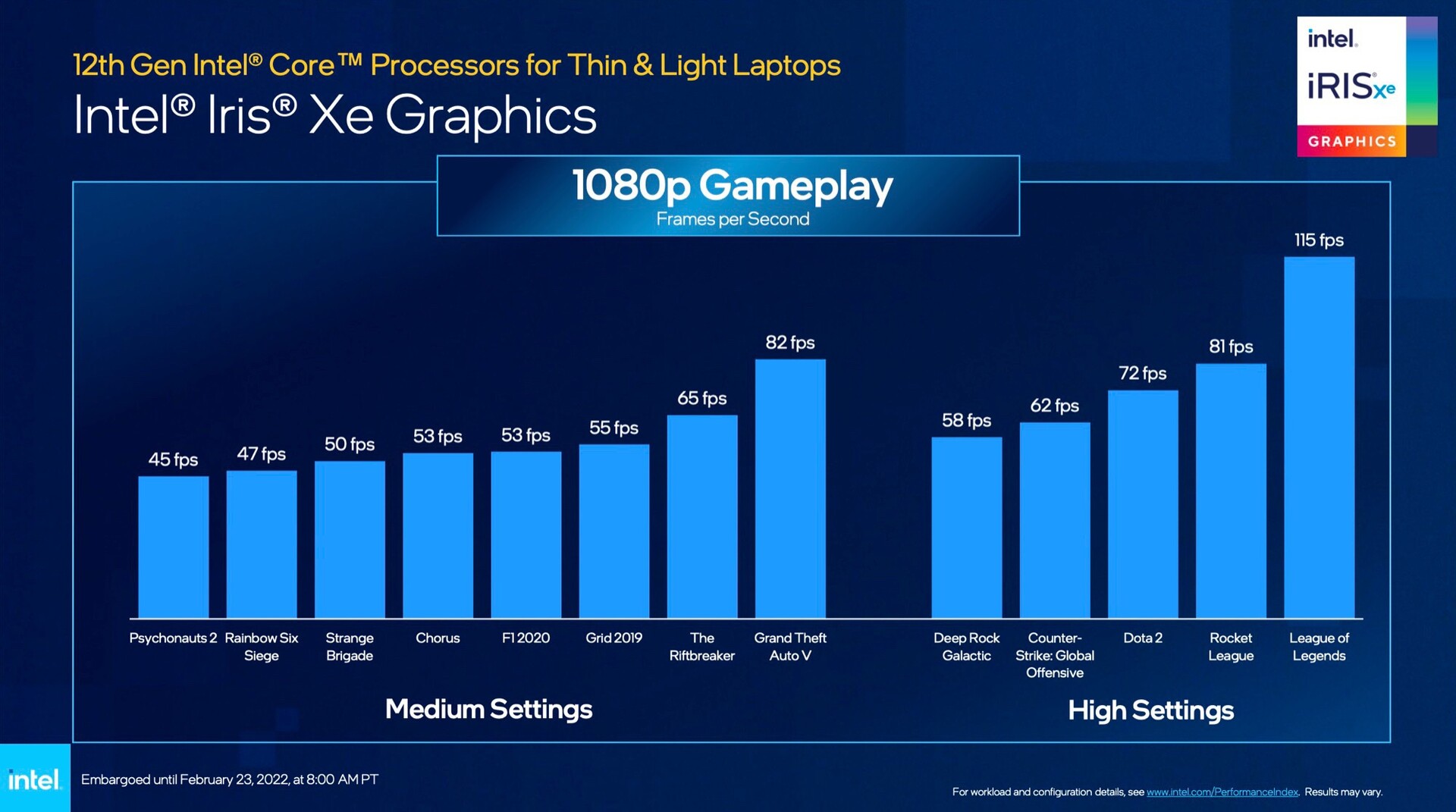 Intel verbaut dieselbe Iris Xe Graphics G7 iGPU, die man bereits von Tiger Lake kennt, der Konzern verspricht aber eine bis zu 50 Prozent bessere Gaming-Performance durch Treiber-Updates. Wie die unten eingebetteten Benchmarks zeigen können mäßig anspruchsvolle Titel wie Strange Brigade, F1 2020 oder auch The Riftbreaker bei 1.080p-Auflösung mit mittleren Details flüssig dargestellt werden, die Radeon 680M iGPU von Ryzen 6000 Mobile ist aber nochmals deutlich schneller.