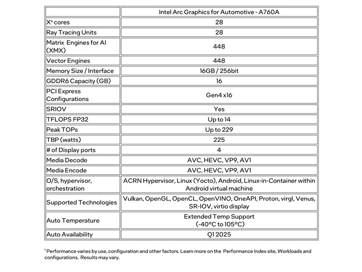 Intel bietet eine Linux-basierte Open-Source-Software samt Treibern an, sodass Auto-Hersteller diese ohne Einschränkungen an ihre Bedürfnisse anpassen können. Die Arc A760A kann bis zu vier Bildschirme ansteuern, und Inhalte maximal in 4K-Auflösung ausgeben. Dank Unterstützung für Vulkan und OpenCL sowie dedizierter Raytracing-Hardware-Beschleuniger sollen auch anspruchsvollere Berechnungen möglich sein. Die Intel Arc A760A soll ab dem ersten Quartal 2025 verfügbar sein.